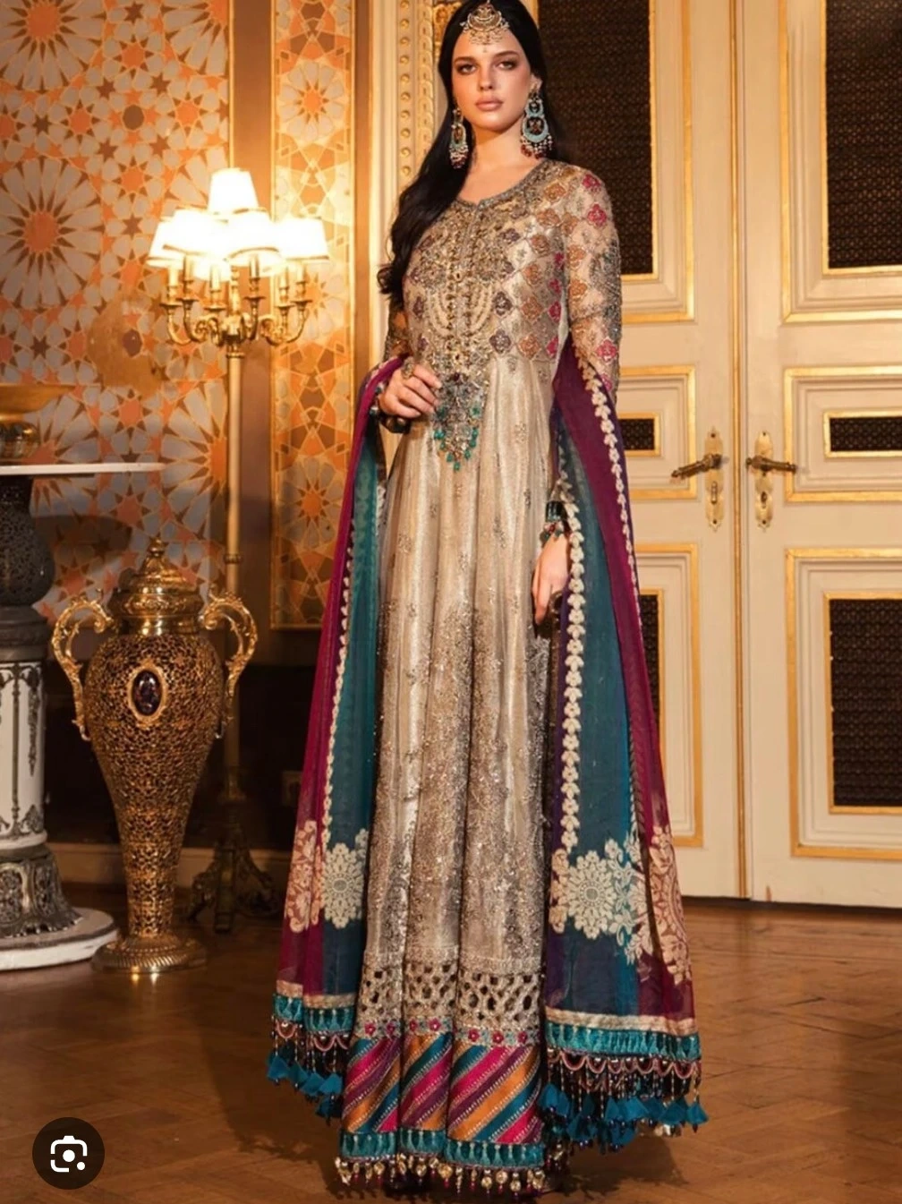This stunning gold and multi-coloured Anarkali suit features intricate embroidery and beadwork. It comes with a matching dupatta. Perfect for formal events and celebrations!