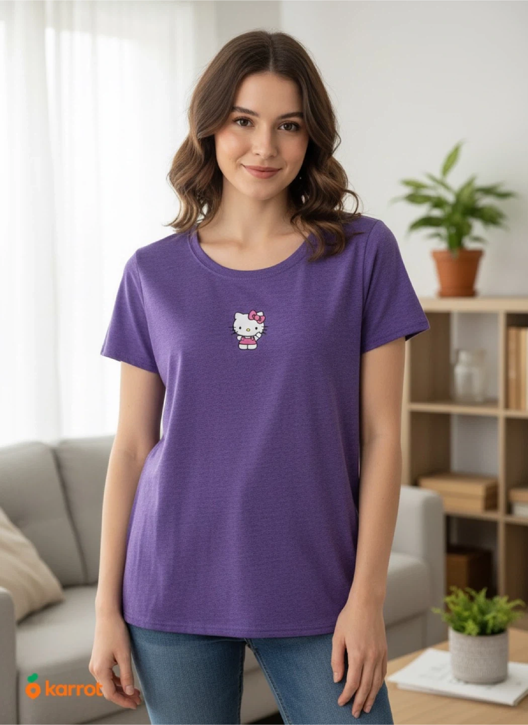 A cute purple t-shirt with a small Hello Kitty graphic on the front. It's a short-sleeved tee. This shirt would be fun for any Hello Kitty fan!