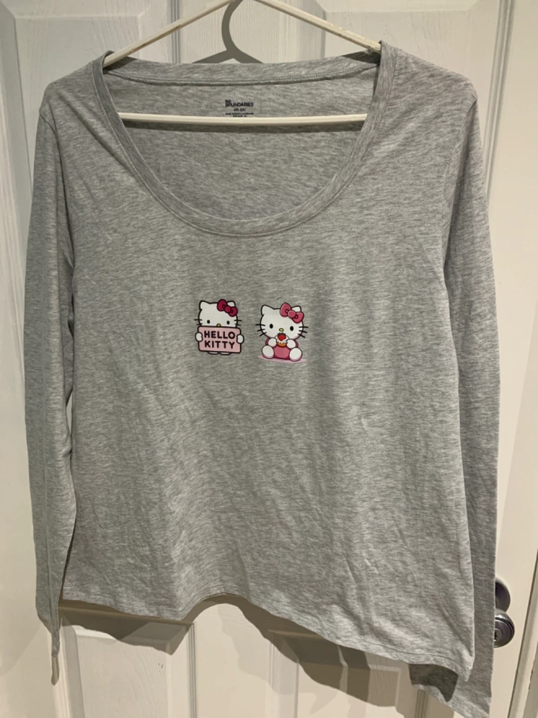 Grey long sleeve shirt with two Hello Kitty graphics on the front. Made of a soft cotton blend. This shirt is a size XXL