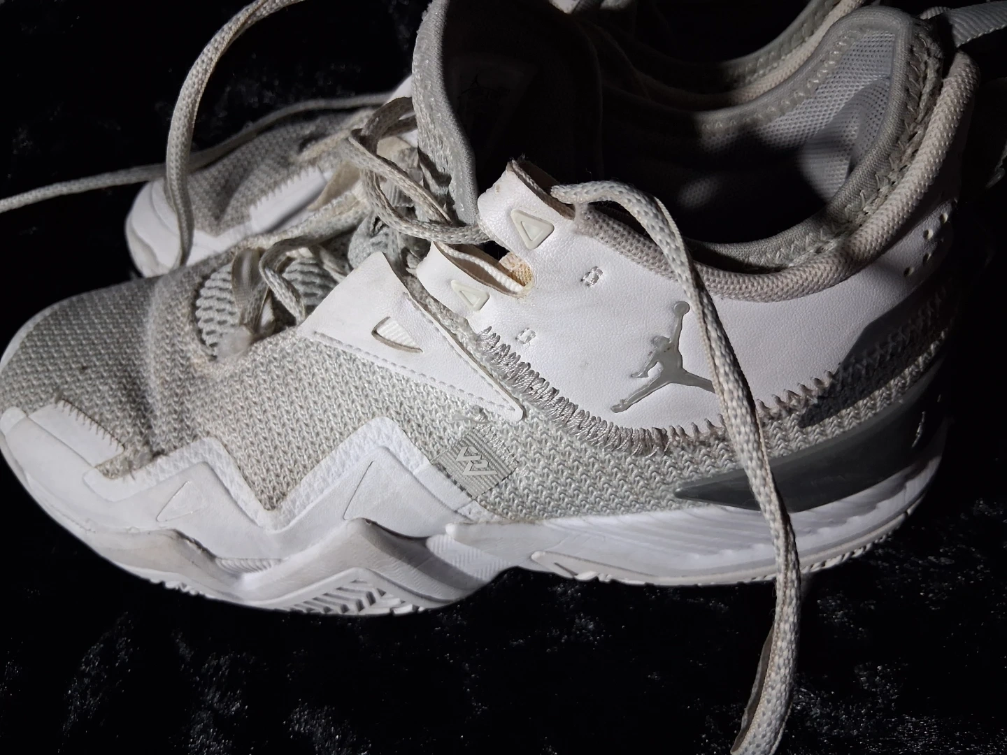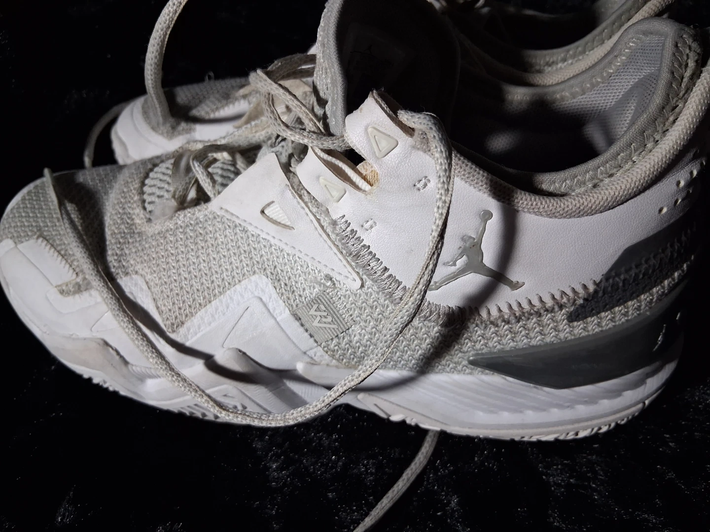 Jordan Westbrook One Take II men's basketball shoes. White and grey colorway. Size 9 US. Made in Vietnam. Features a textile and synthetic upper. These shoes are designed for basketball performance.