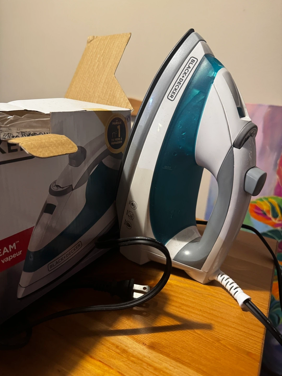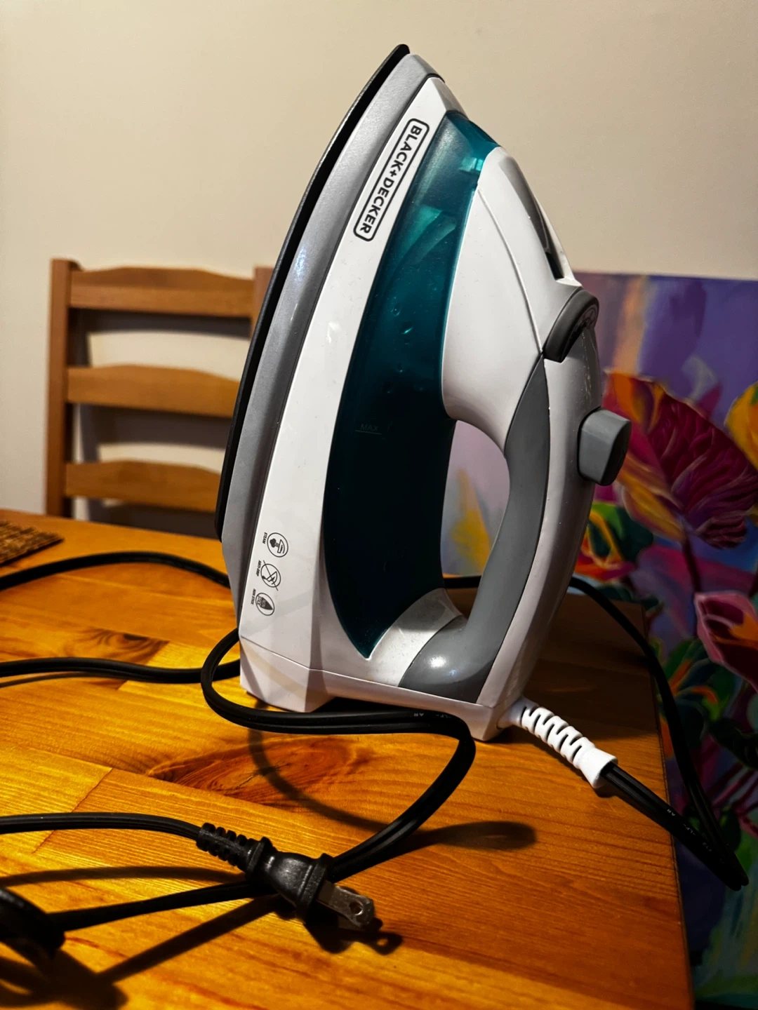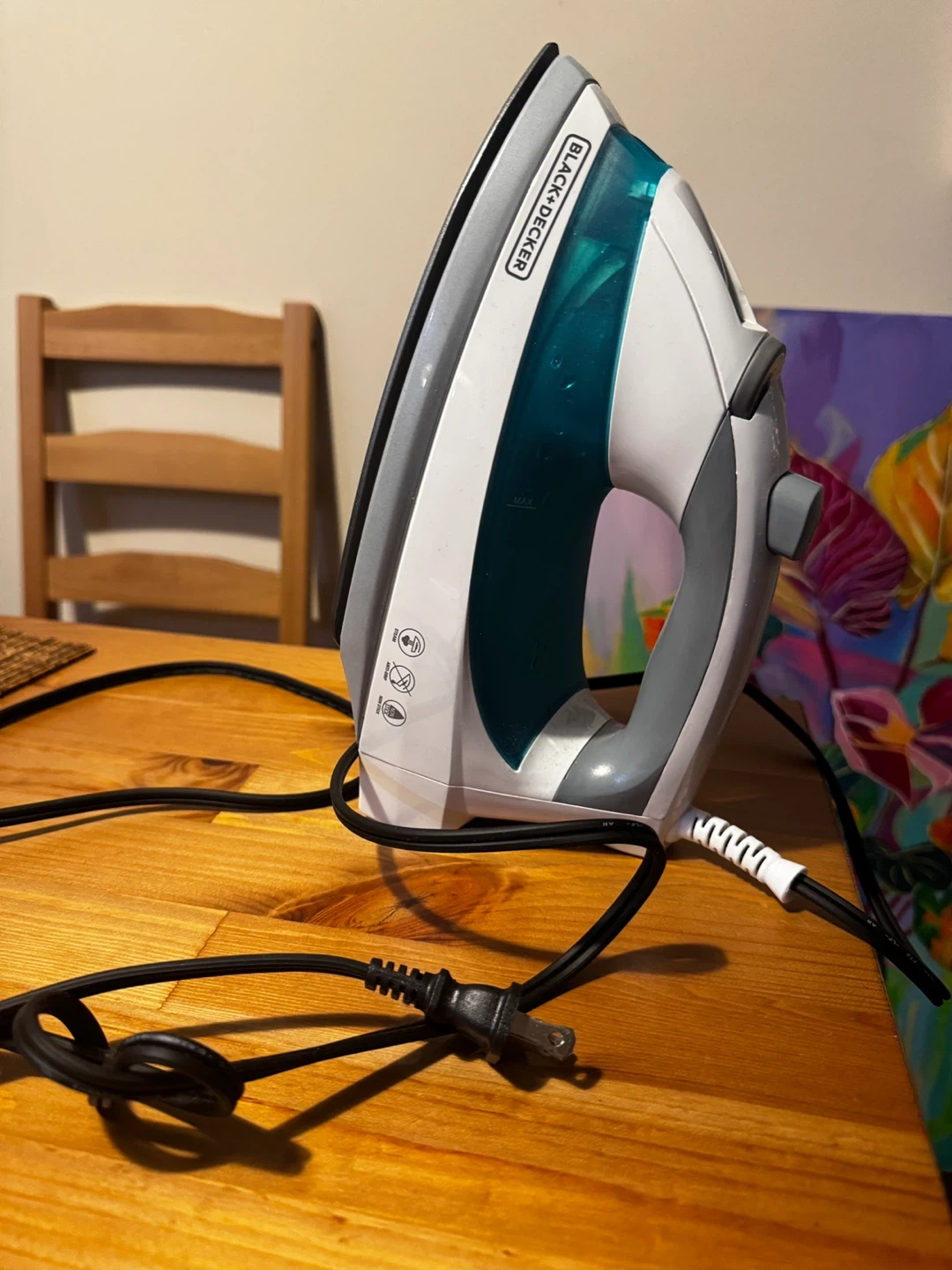 This Black+Decker light N' easy steam iron is white and teal