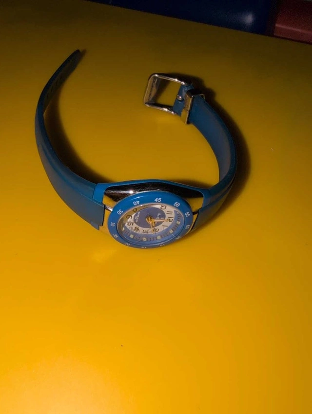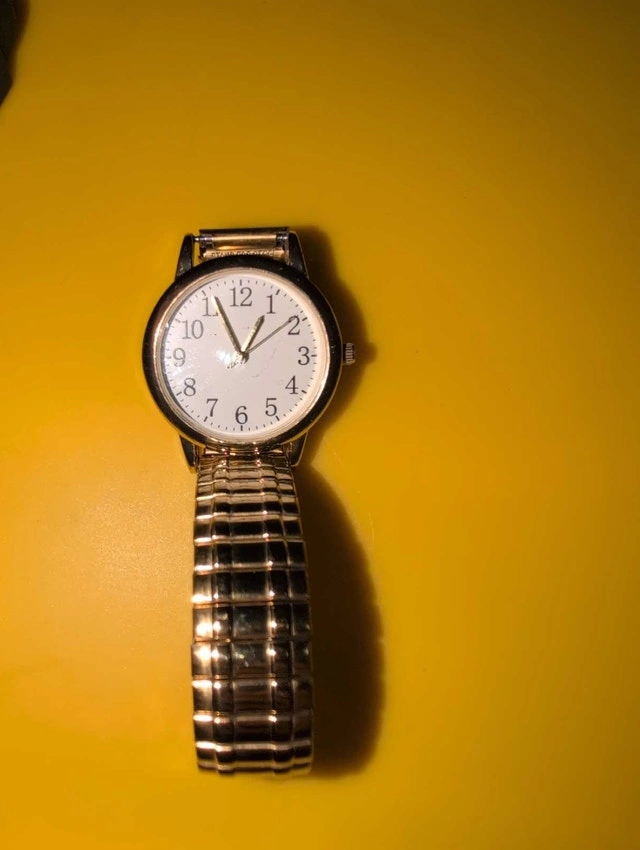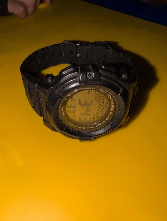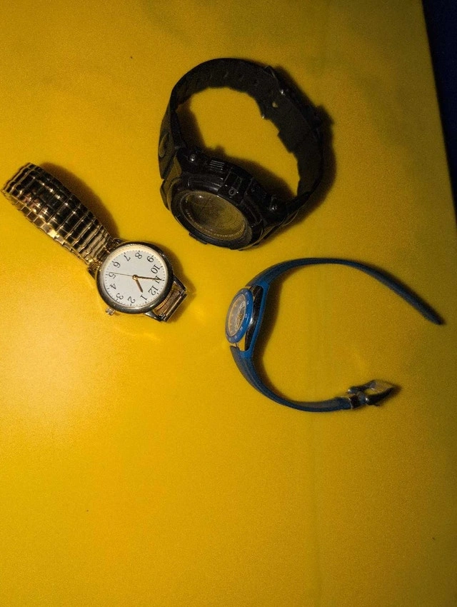 Selling three used watches: a black digital watch, a gold-tone watch, and a blue watch. They show some signs of wear but are still functional. Selling as a set. Cash accepted.