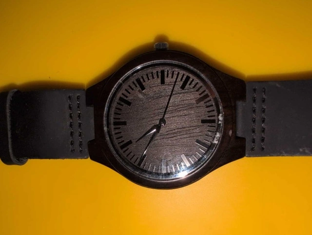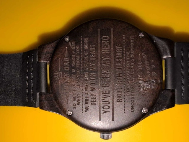 This unique wooden watch makes a stylish and sentimental gift for a father, featuring an engraved message on the back. The watch is in good condition, with a sleek black design and a comfortable leather strap. If the ad is still up, the watch is still available for purchase.