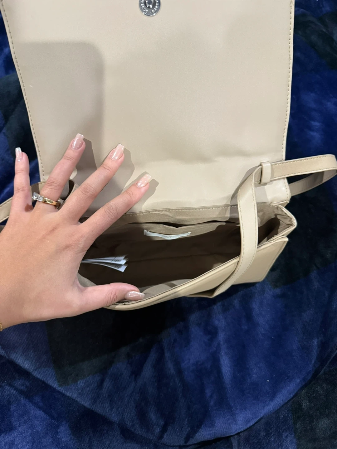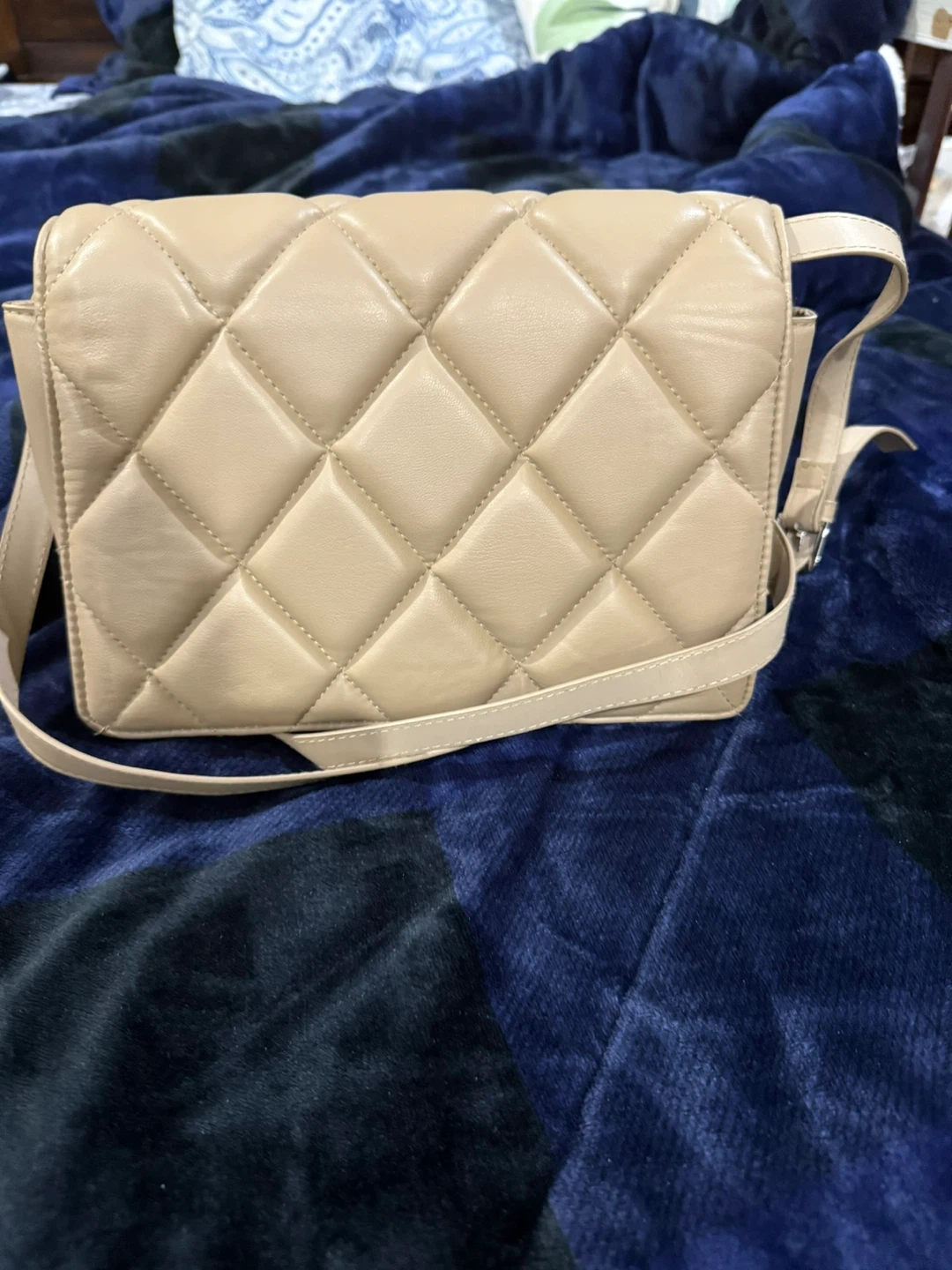 This is a beige quilted crossbody bag from H&M. It features a flap closure and a simple strap. The interior has a small pocket. Never used.