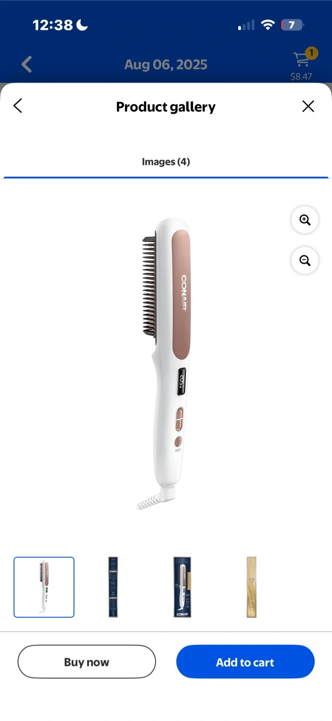 This Conair hair straightener brush features a ceramic coating for smooth styling. It has adjustable temperature settings with a digital display and an on/off button. The brush is white with rose gold accents.