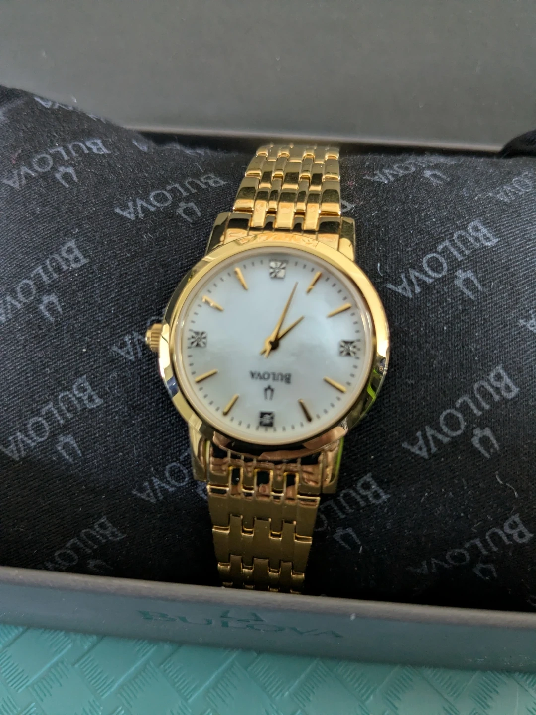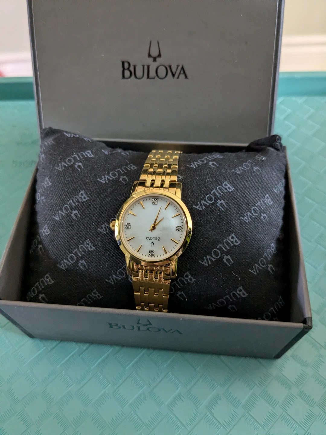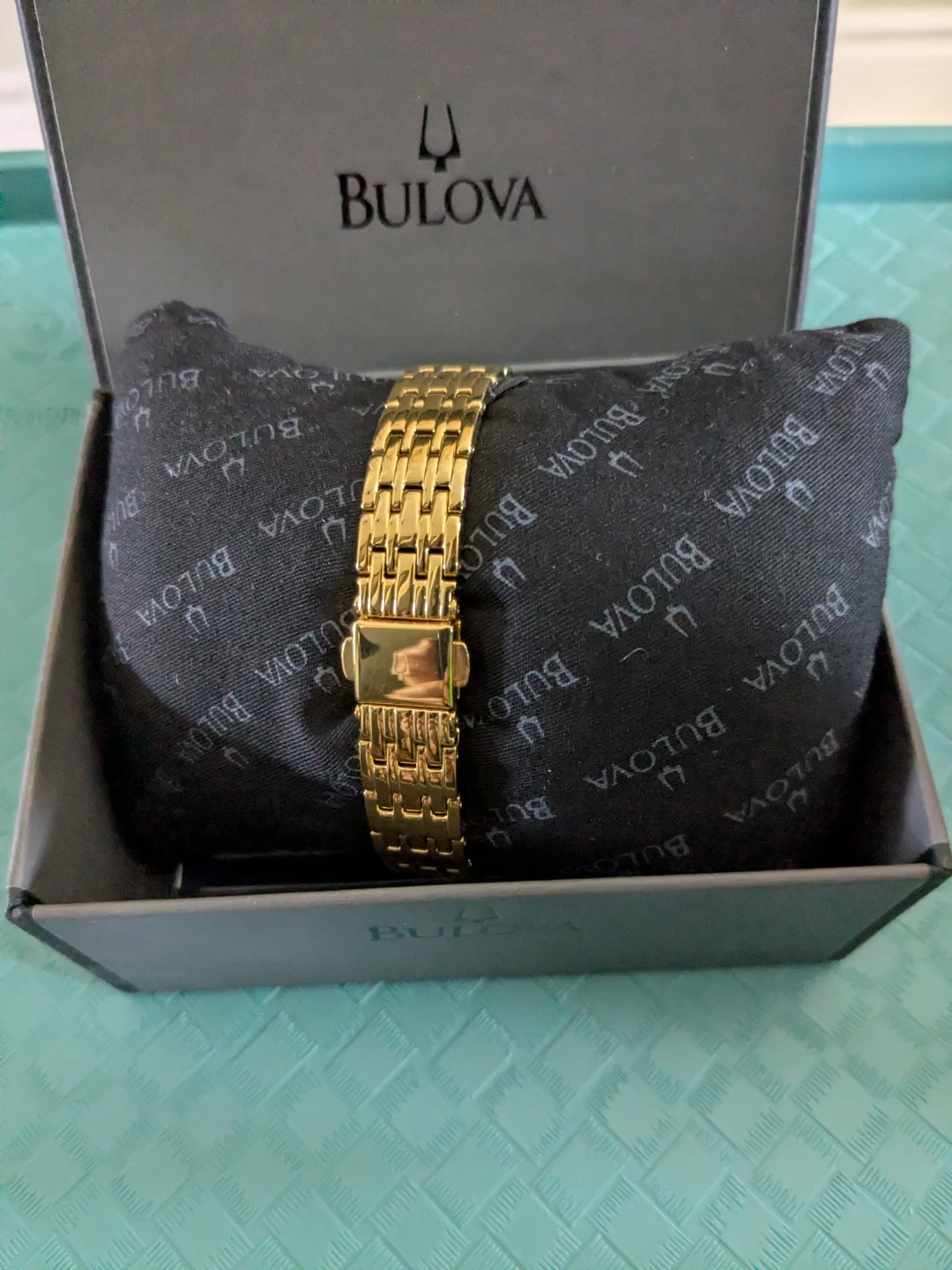 This Bulova watch features a classic gold-tone finish and a white dial with diamond hour markers. It comes with its original box and cushion. Perfect for adding a touch of elegance to any outfit!