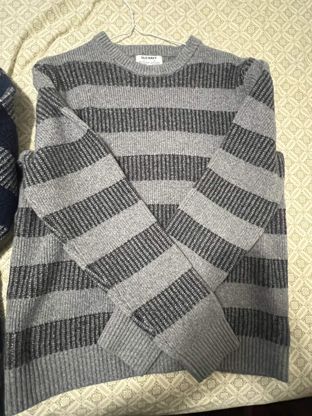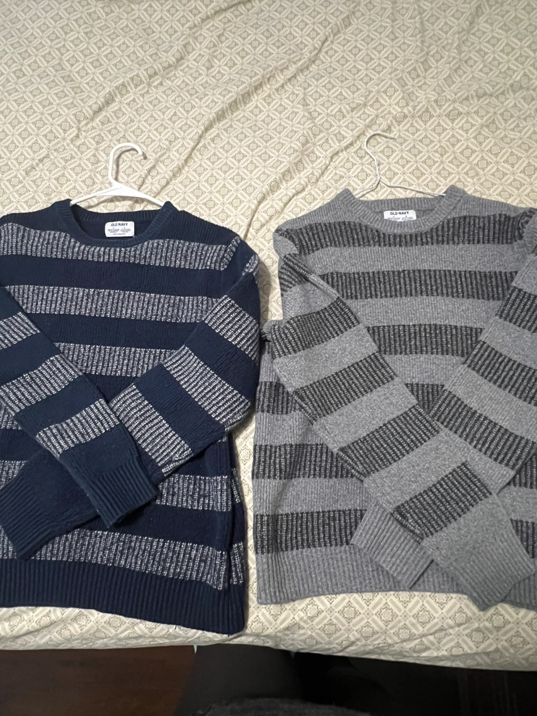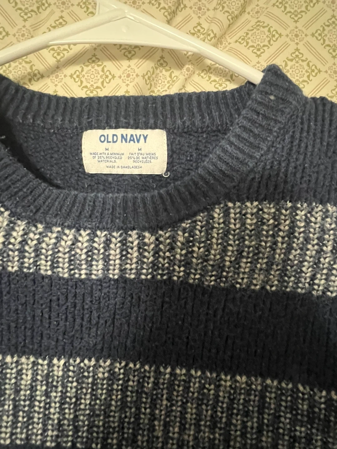 Two Old Navy sweaters with horizontal stripes. Made with a minimum of 30% recycled materials. Size is medium.