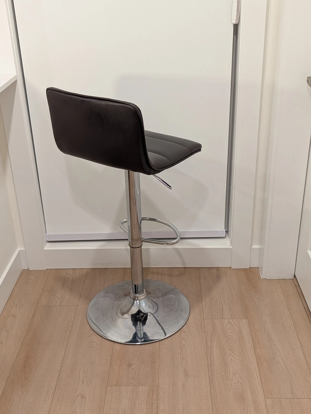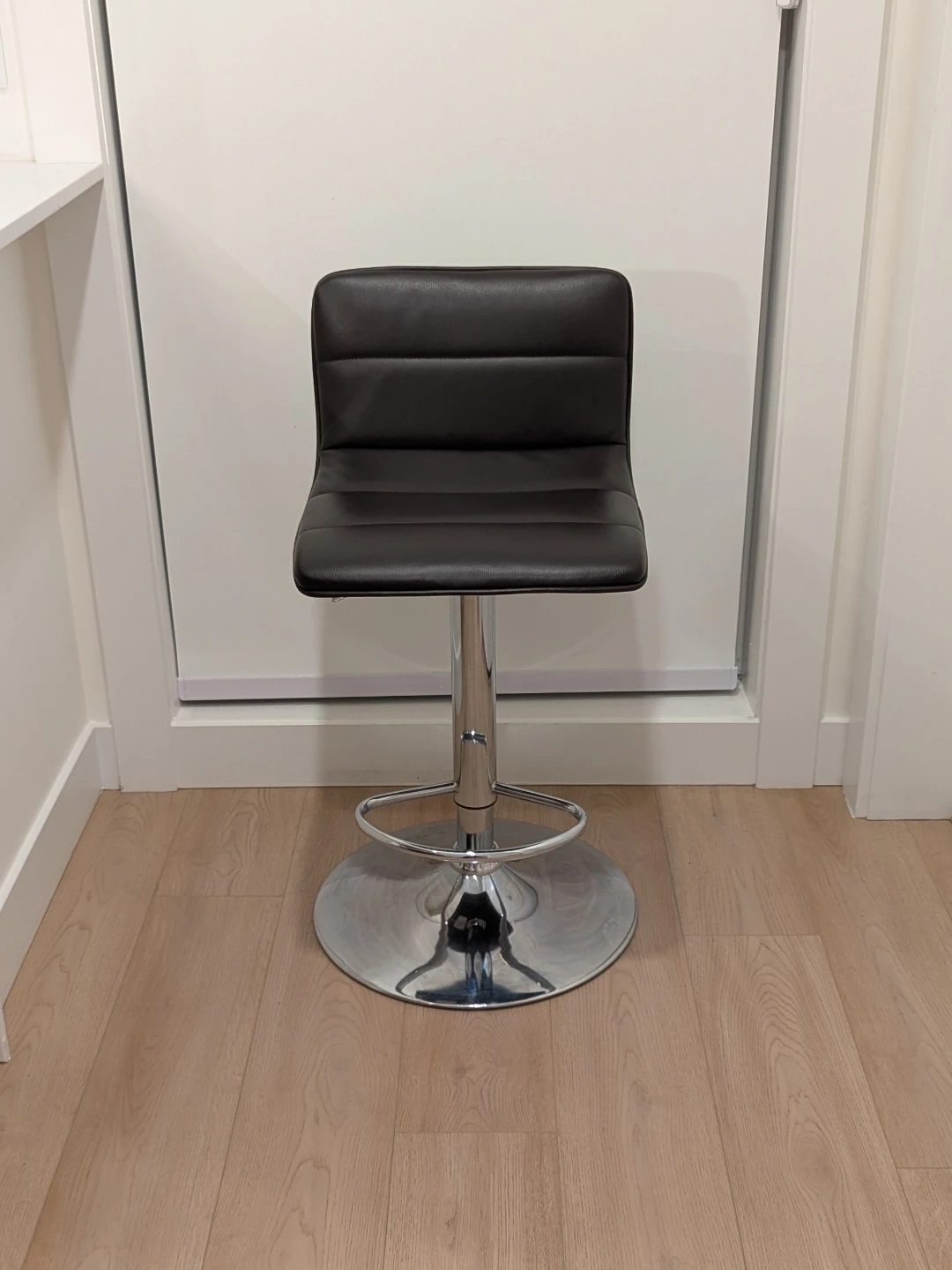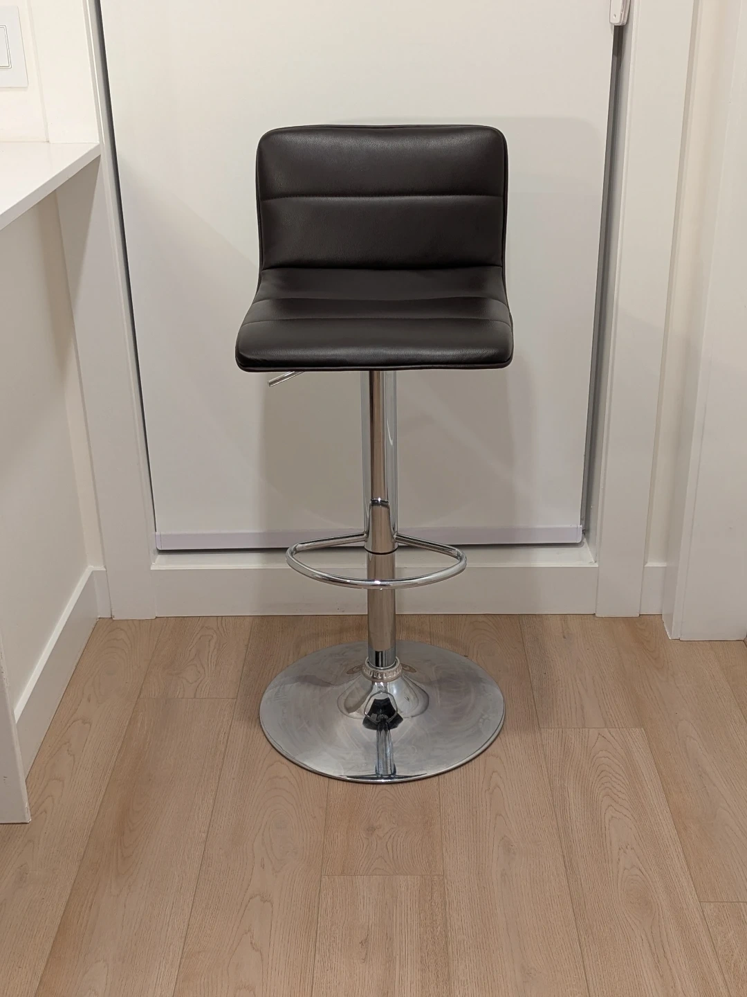 This bar stool features dark brown faux leather upholstery and a polished chrome base. It's height-adjustable with a built-in footrest. This stool is suitable for a kitchen counter or home bar.