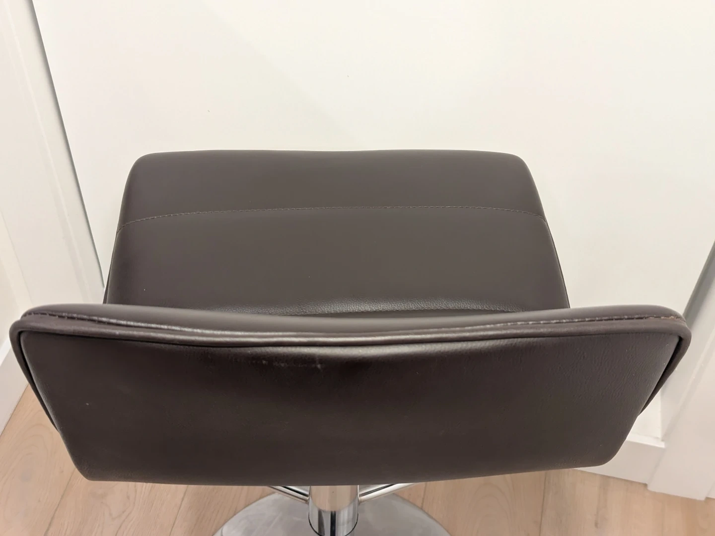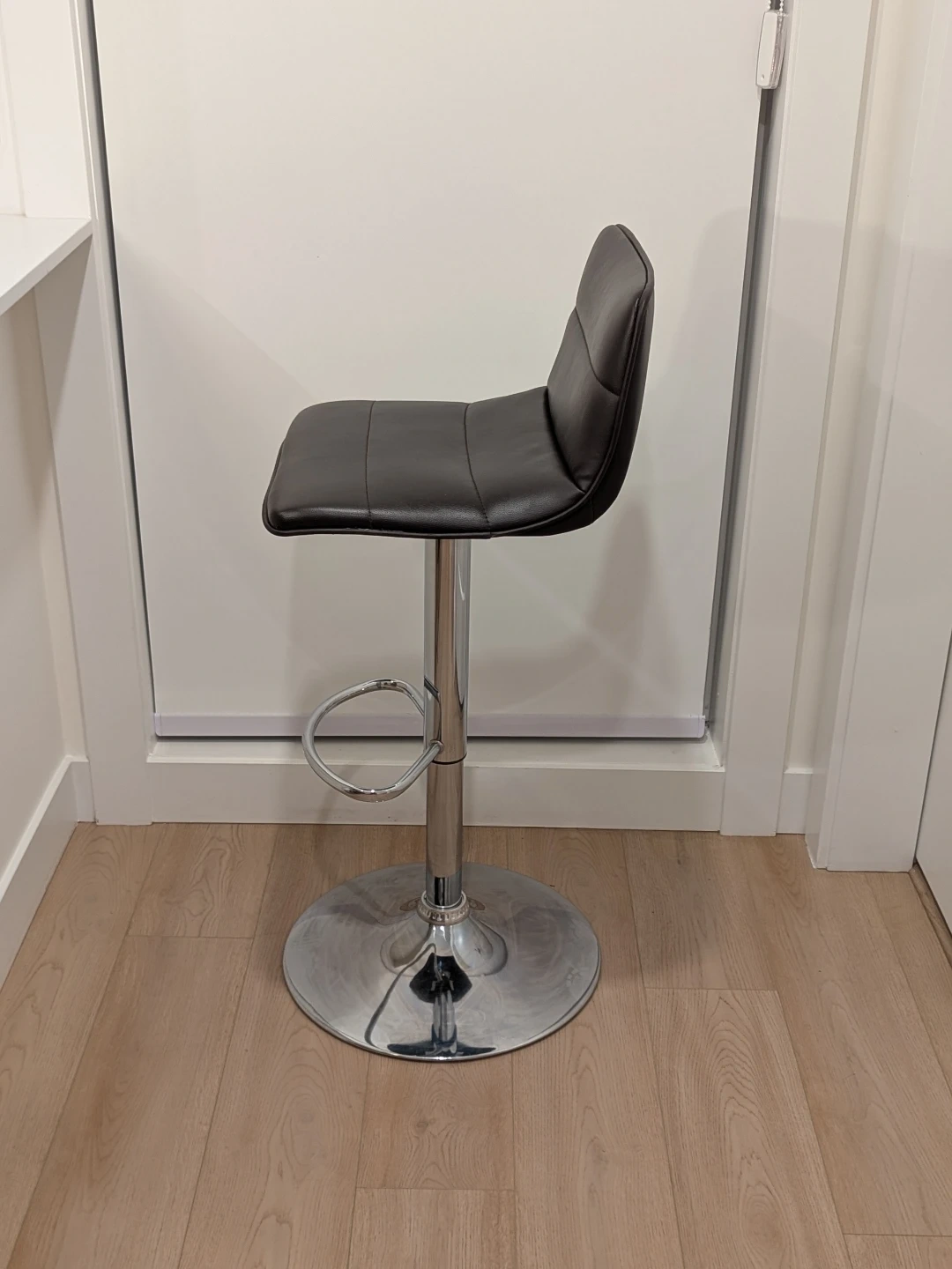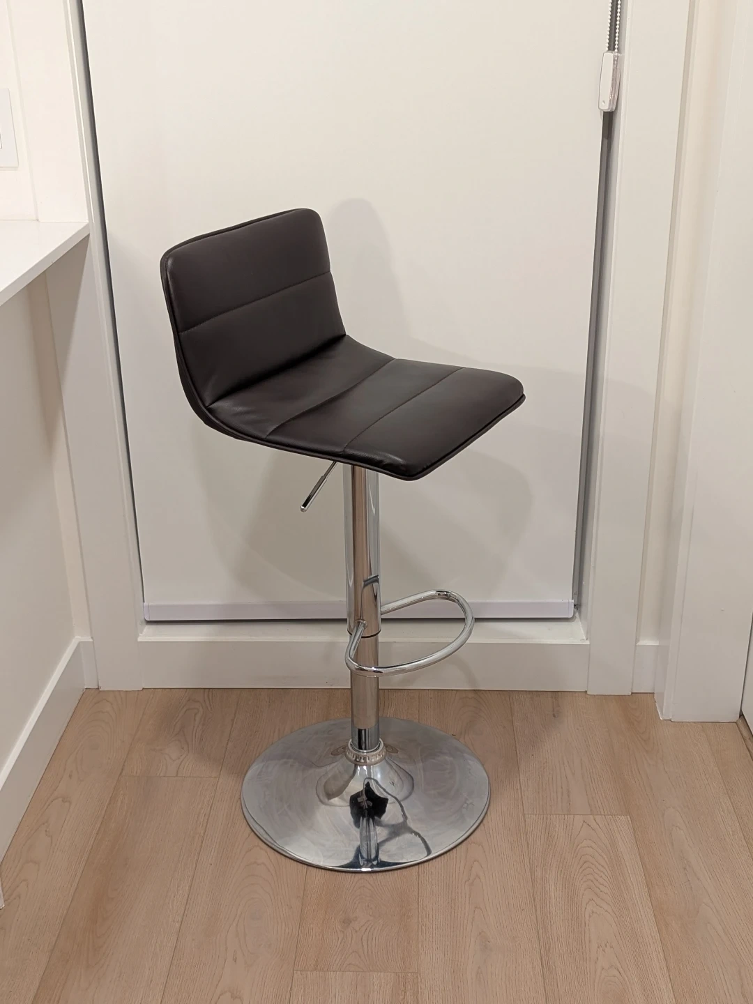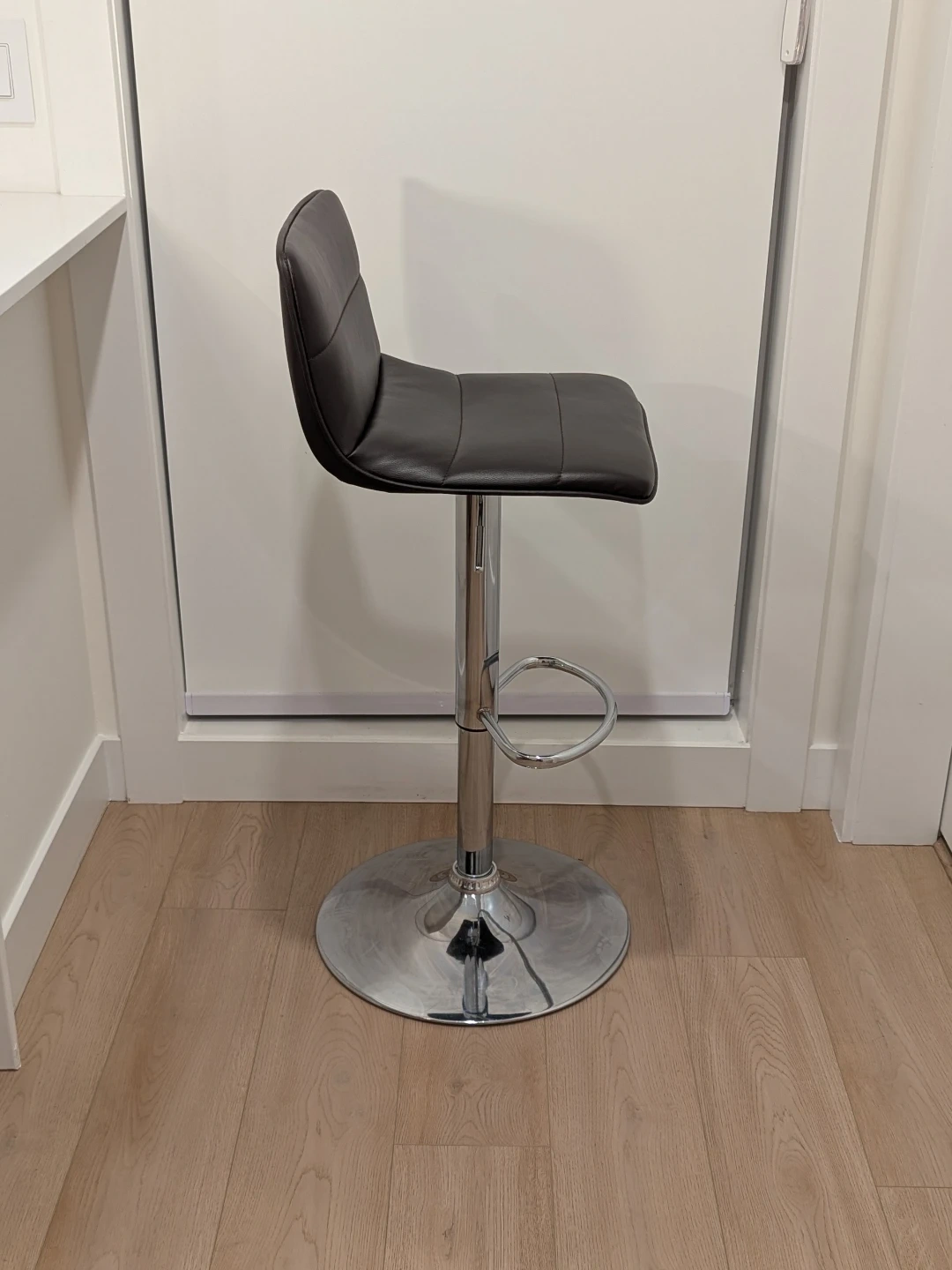 This bar stool features dark brown faux leather upholstery and a polished chrome base. It's height-adjustable with a built-in footrest. This stool is suitable for a kitchen counter or home bar.