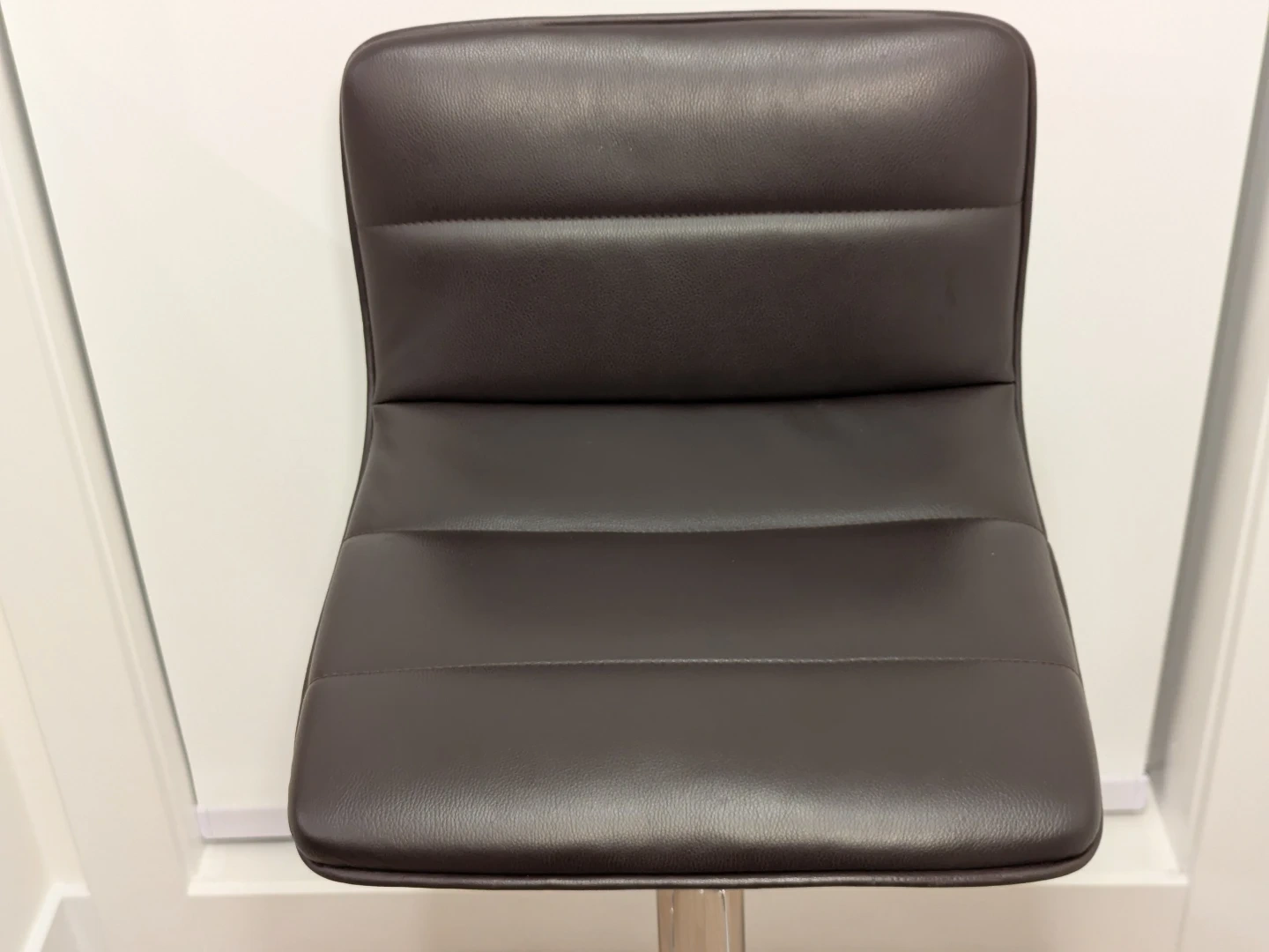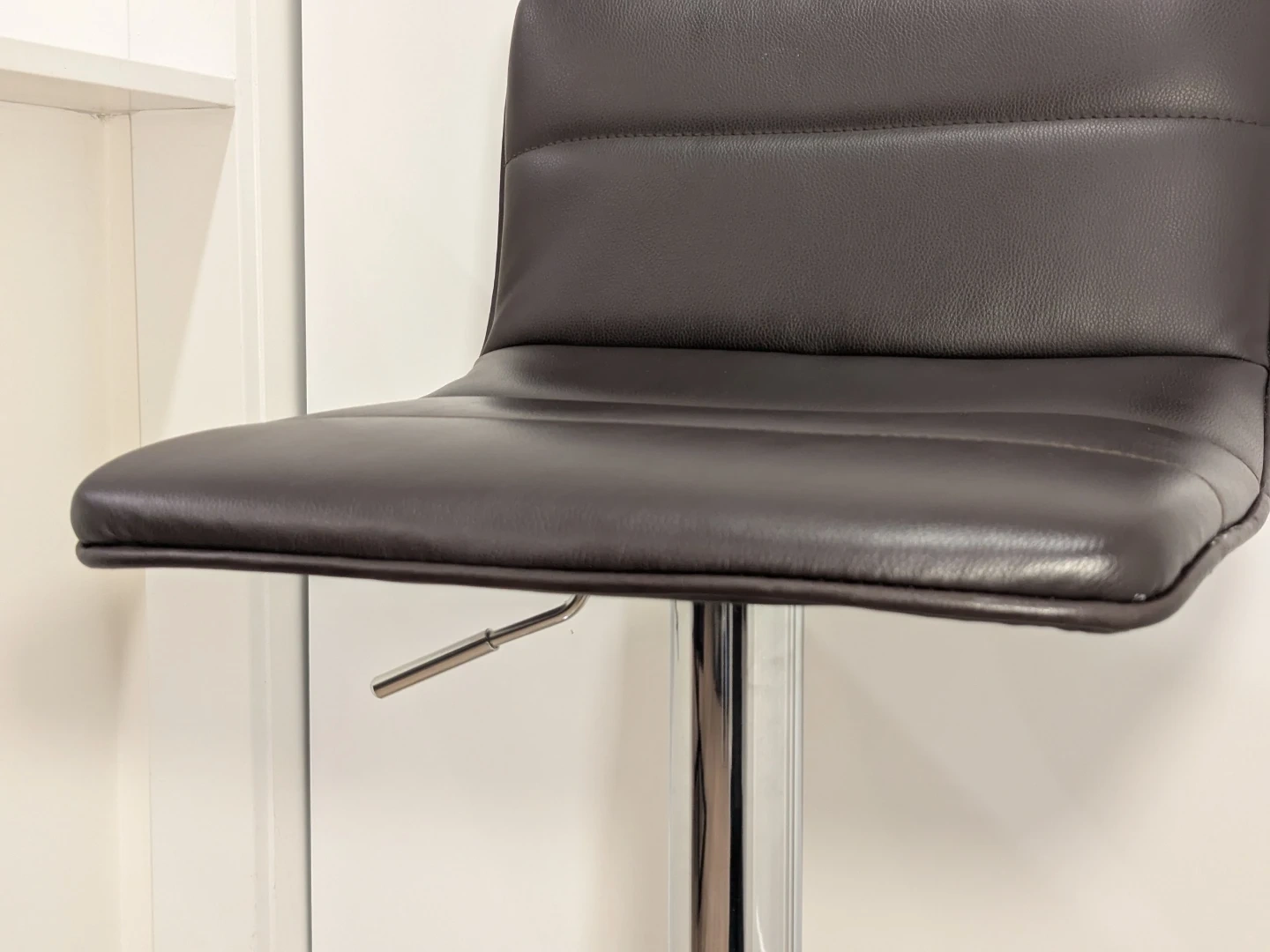 This bar stool features dark brown faux leather upholstery and a polished chrome base. It's height-adjustable with a built-in footrest. This stool is suitable for a kitchen counter or home bar.