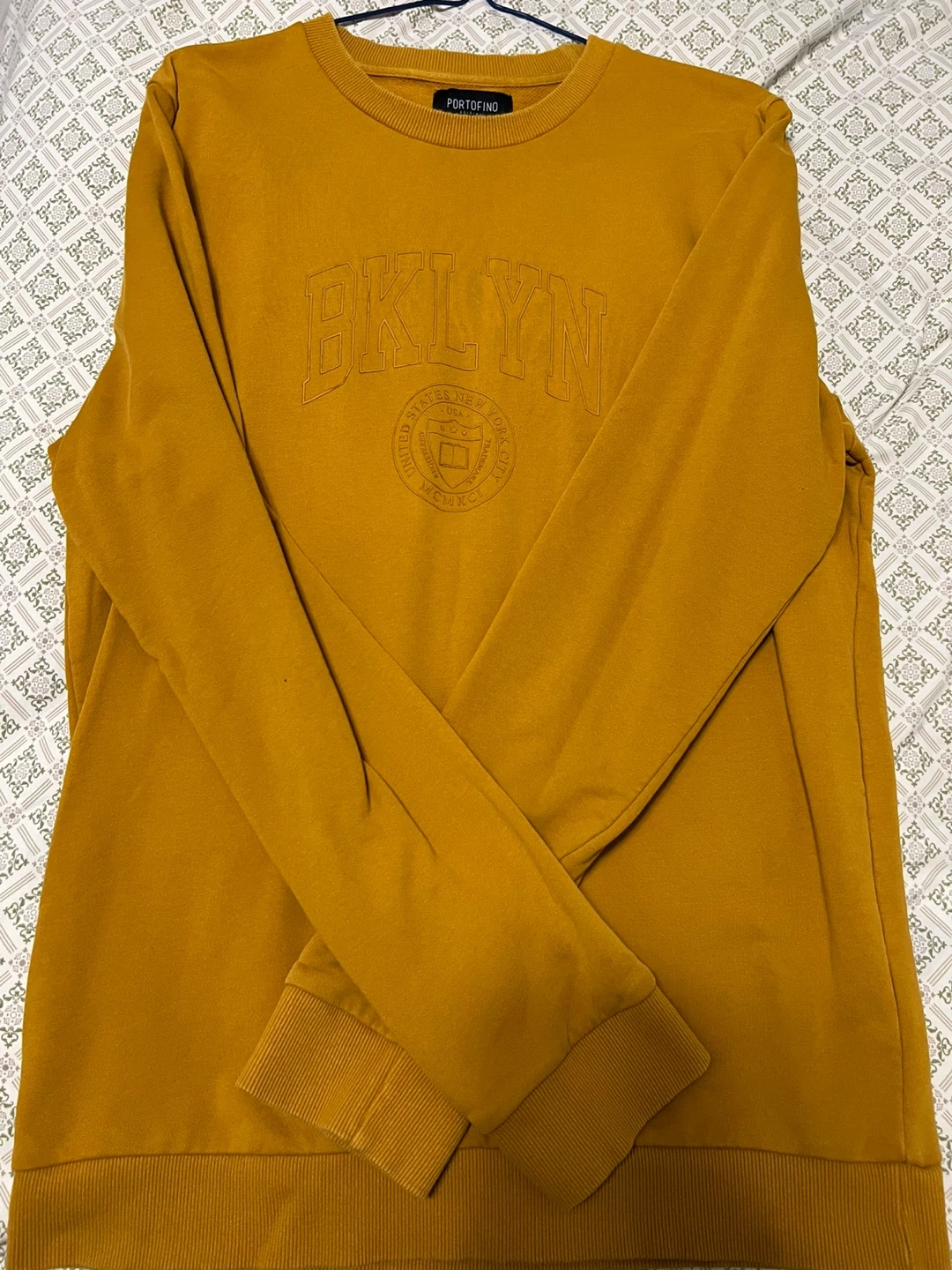 This Portofino Original sweatshirt is a comfy, mustard yellow pullover. It features an embroidered "BKLYN" graphic on the front and a "United States of America" crest detail. Size is large.