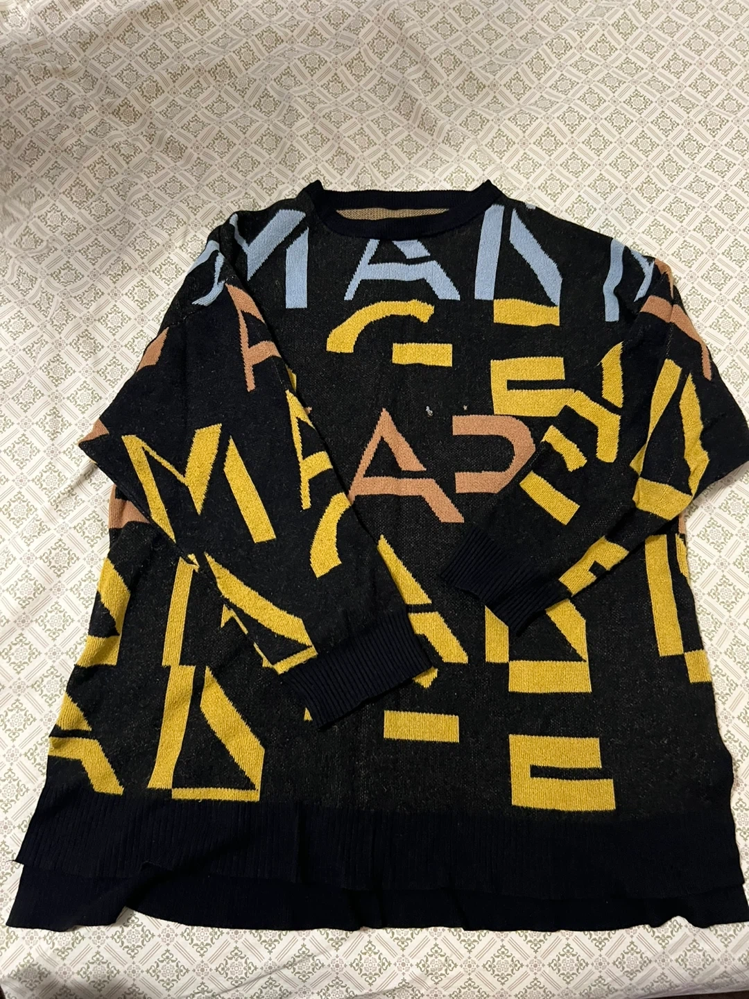 This is a cozy black sweater with a bold graphic print of multicoloured letters. It has a relaxed fit and ribbed cuffs and hem. The material is a soft knit, perfect for cooler weather.
