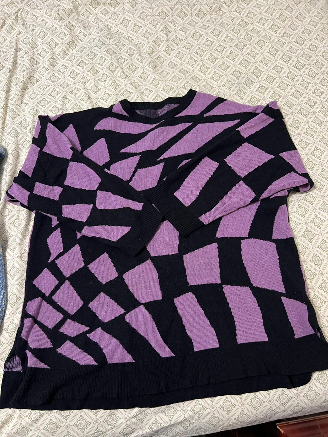 This is a long-sleeved knit sweater featuring a bold purple and black checkerboard pattern. It's made from a soft knit material. This sweater's unique design makes it a standout piece for casual wear.