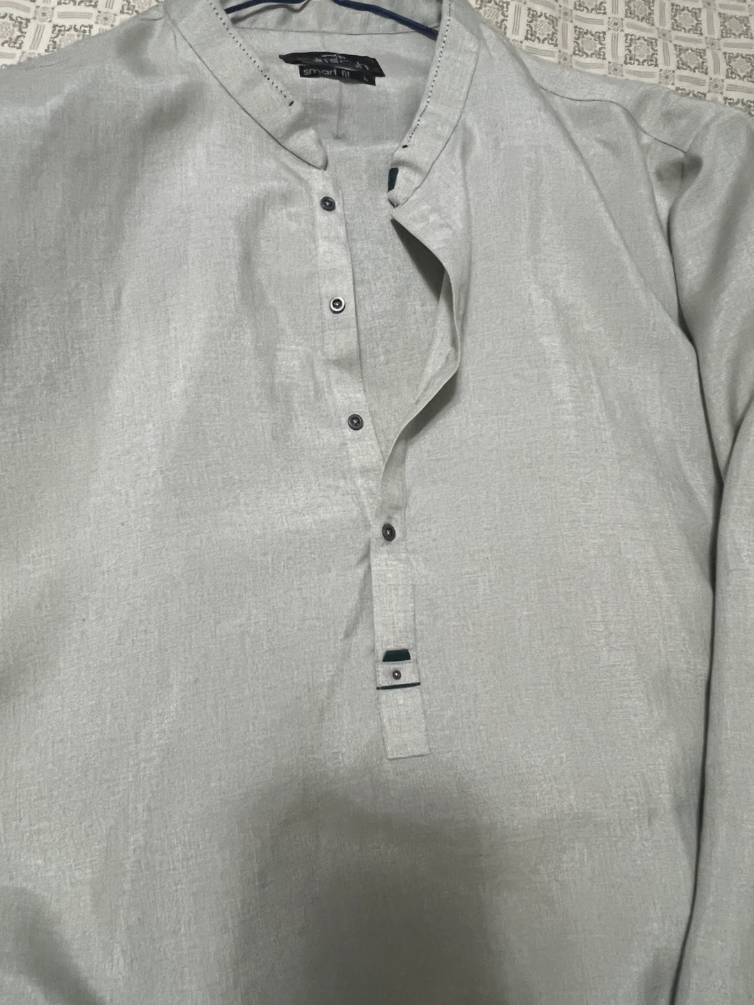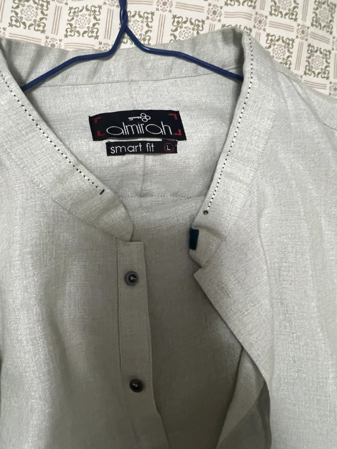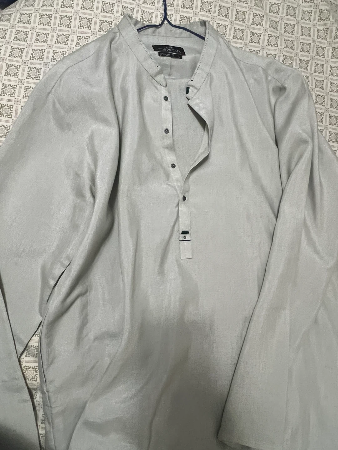 This is a men's kurta from Almirah in a light grey colour. It's a size L with a smart fit and has a band collar with button detailing. The material appears to be a linen blend.