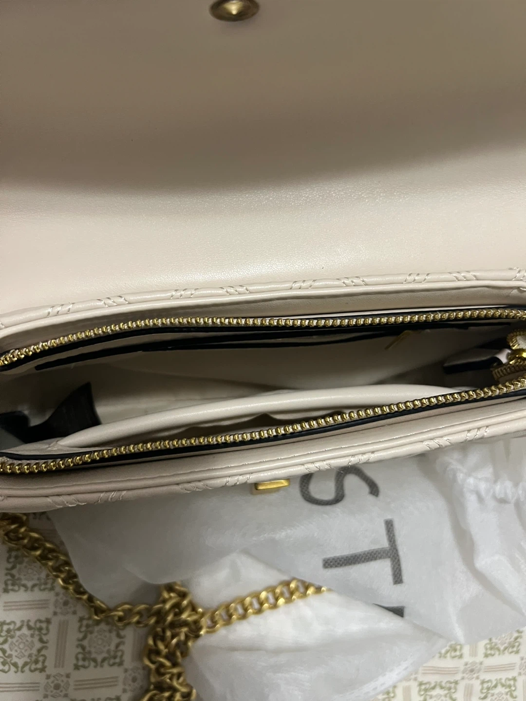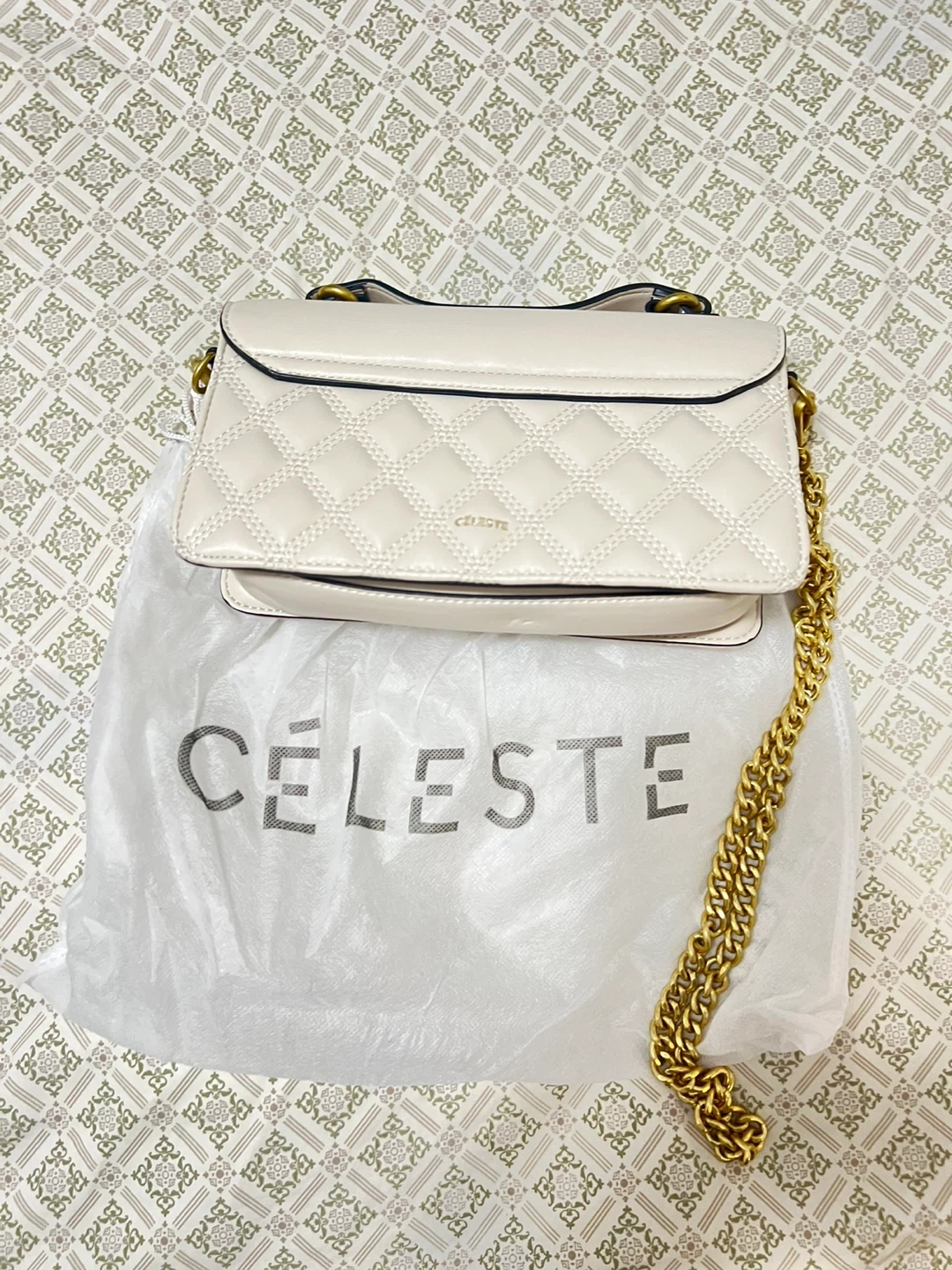 Stylish cream quilted handbag from Celeste. It features a secure gold clasp closure and a detachable gold chain strap. Includes a dust bag for storage.
