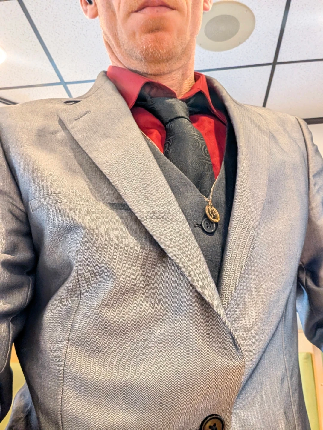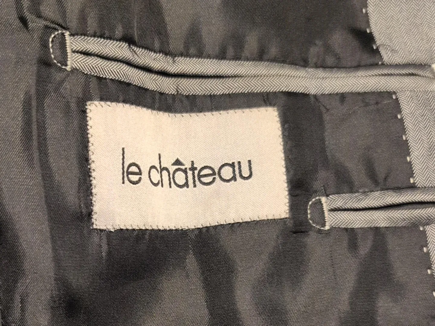 Le Château men's suit jacket in a classic grey colour. It's a stylish addition to any formal or business casual outfit. Material composition not visible.