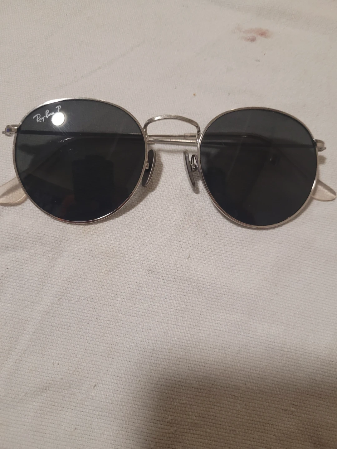 These are Ray-Ban polarized sunglasses with a round metal frame. They feature dark tinted lenses for sun protection. You can wear them on sunny days.