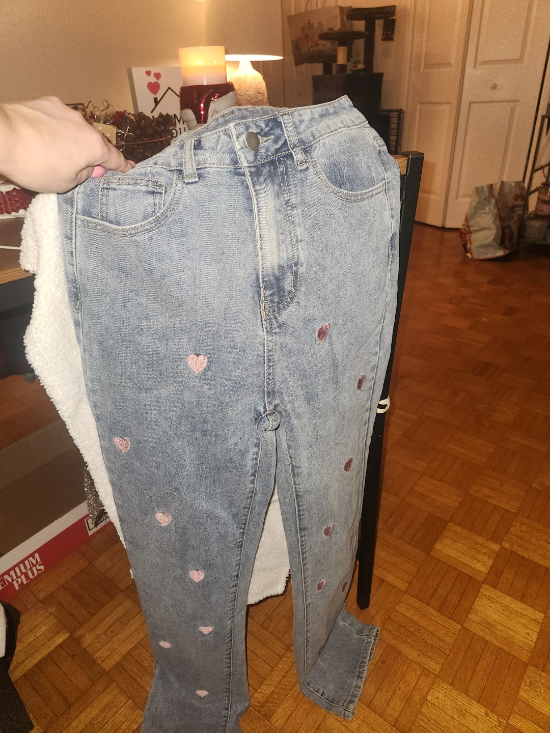 Light Wash Denim Jeans with Pink Heart Embroidery