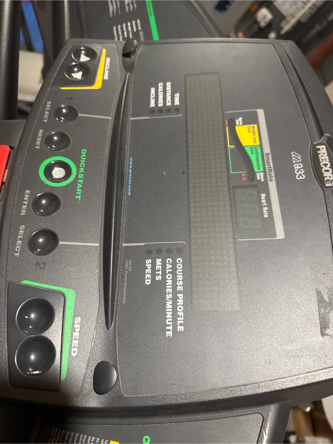This is a Precor 9.33 treadmill. It has a large display panel showing time, distance, incline, speed, METs, and calories/minute. Quickstart function available.