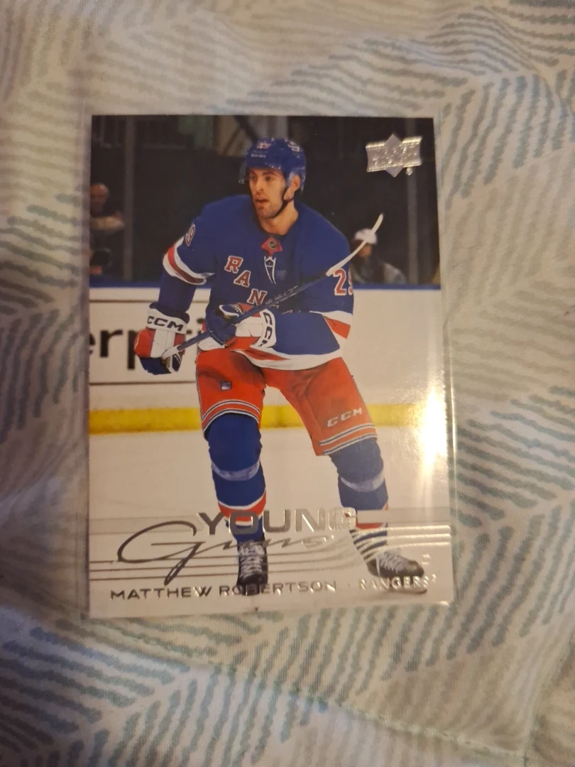 This is a 2021-22 Upper Deck Young Guns rookie card featuring Matthew Robertson of the New York Rangers. It's a great addition for any hockey card collector. The card details his stats and draft information.