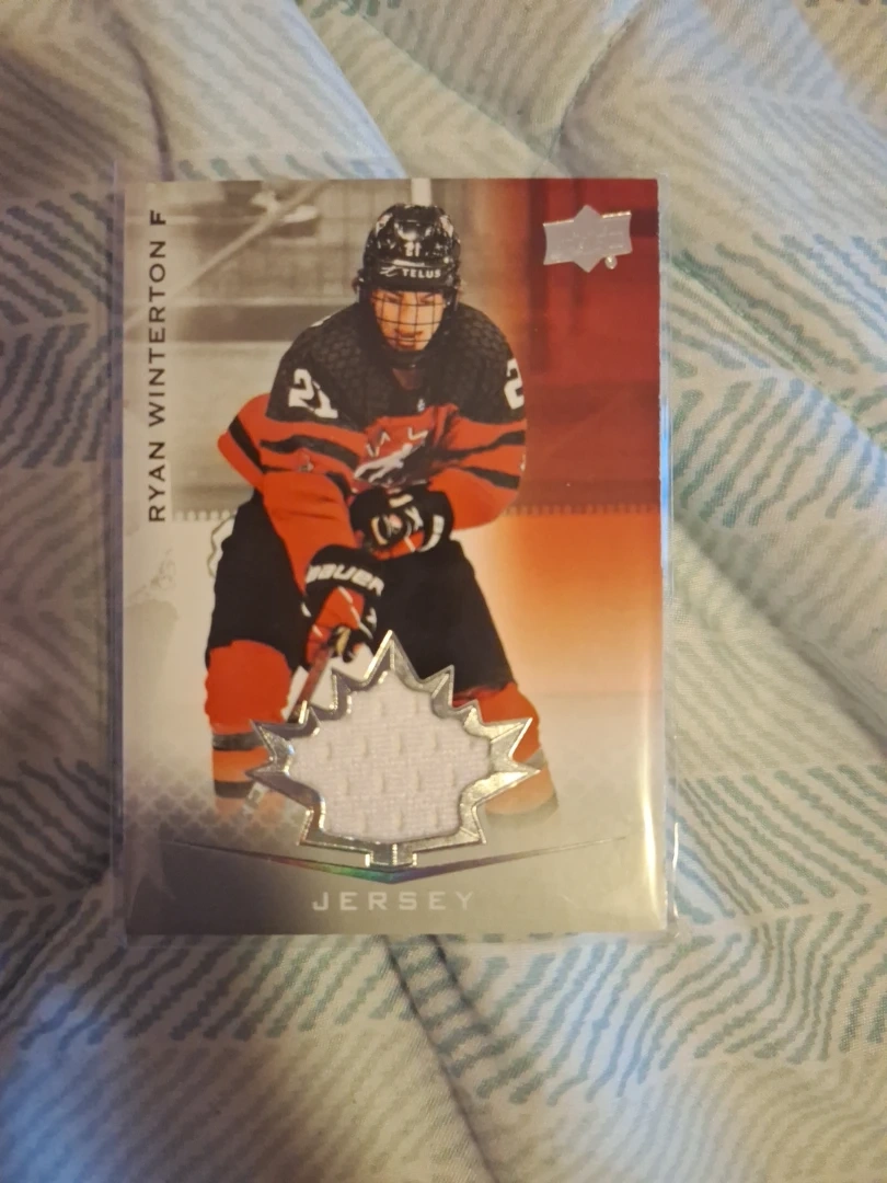 This is a 2021 Upper Deck Ryan Winterton game-used hockey memorabilia card. It's officially certified by Upper Deck as having been used in an official Team Canada hockey game. The card features a piece of jersey used by the player.