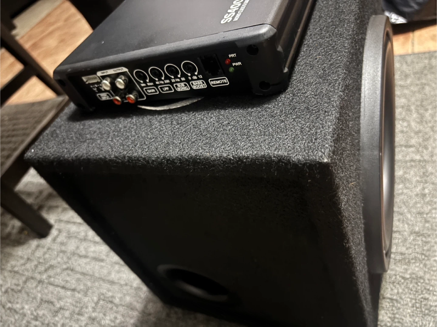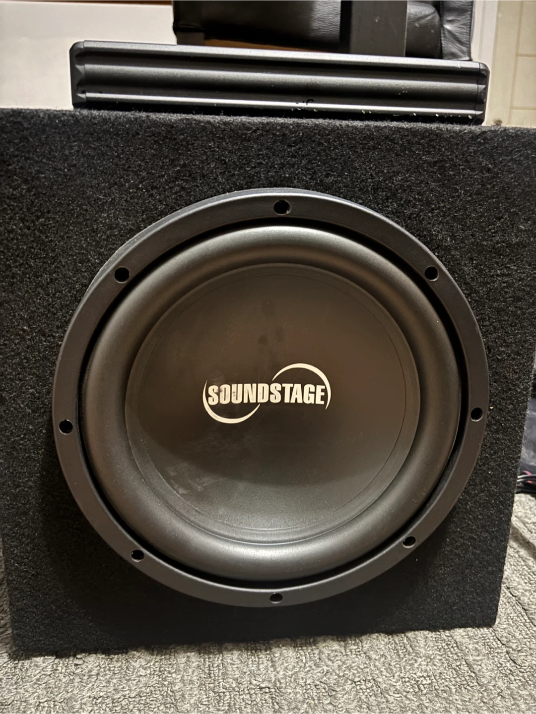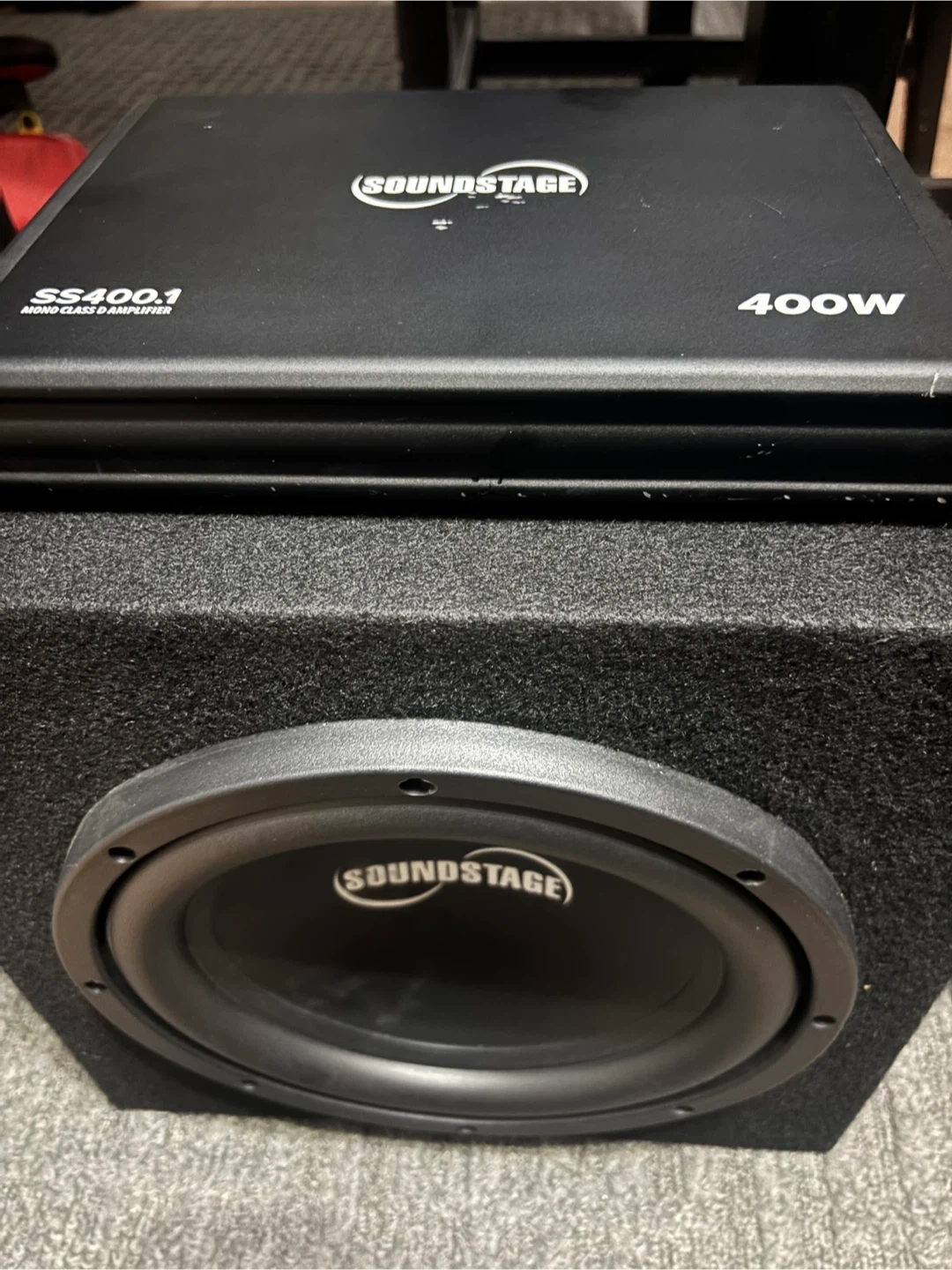 This is a SoundStage subwoofer in a black carpeted enclosure, paired with a SoundStage SS400.1 mono amplifier. The amplifier is rated at 400W. Both are in good working condition.