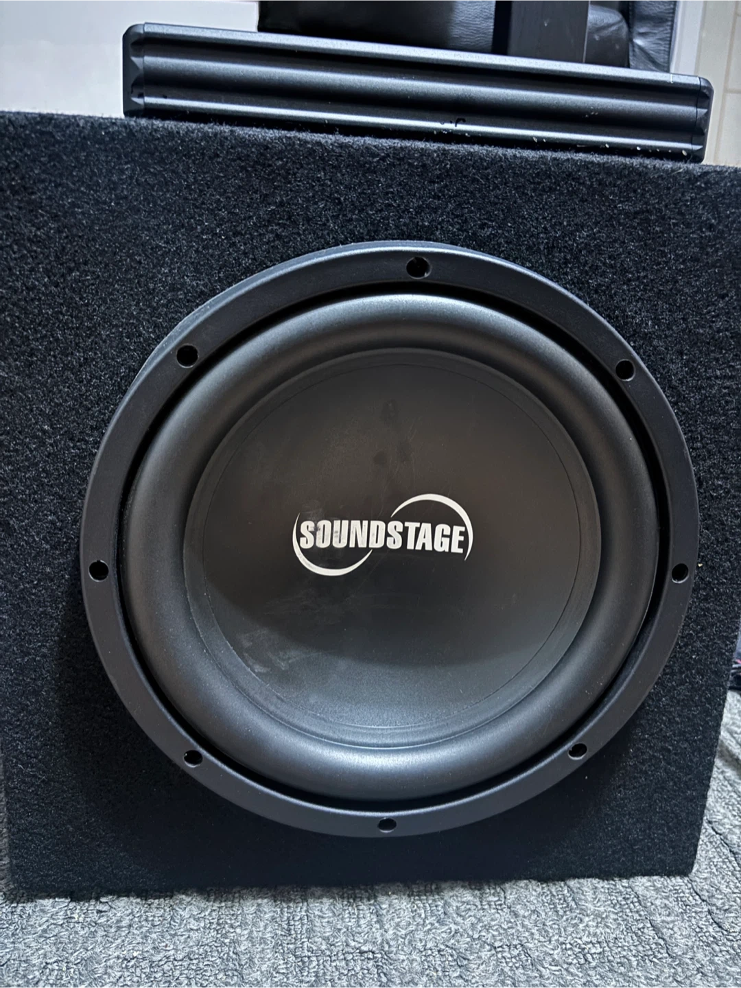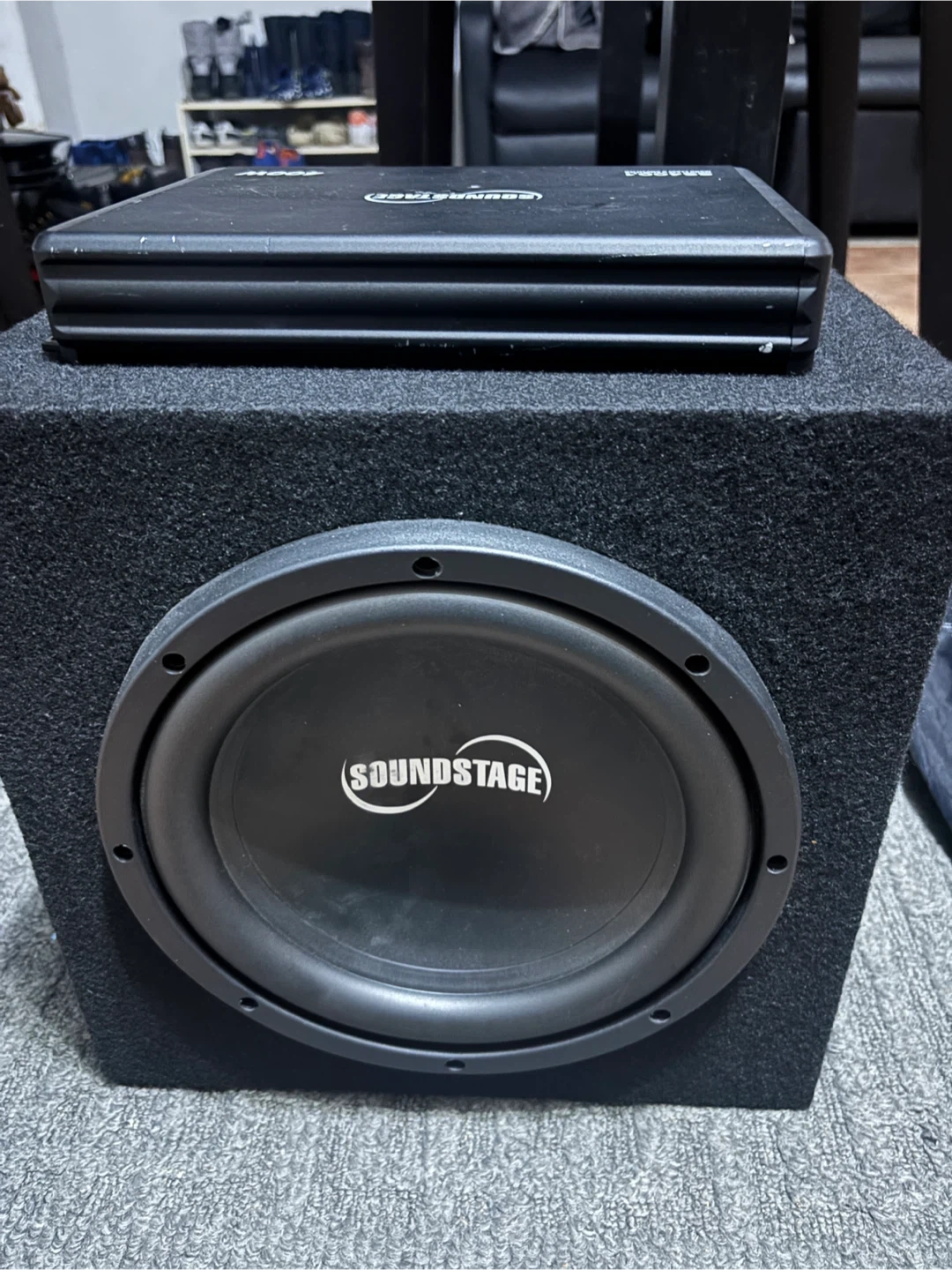 This is a SoundStage subwoofer in a black carpeted enclosure, paired with a SoundStage SS400.1 mono amplifier. The amplifier is rated at 400W. Both are in good working condition.