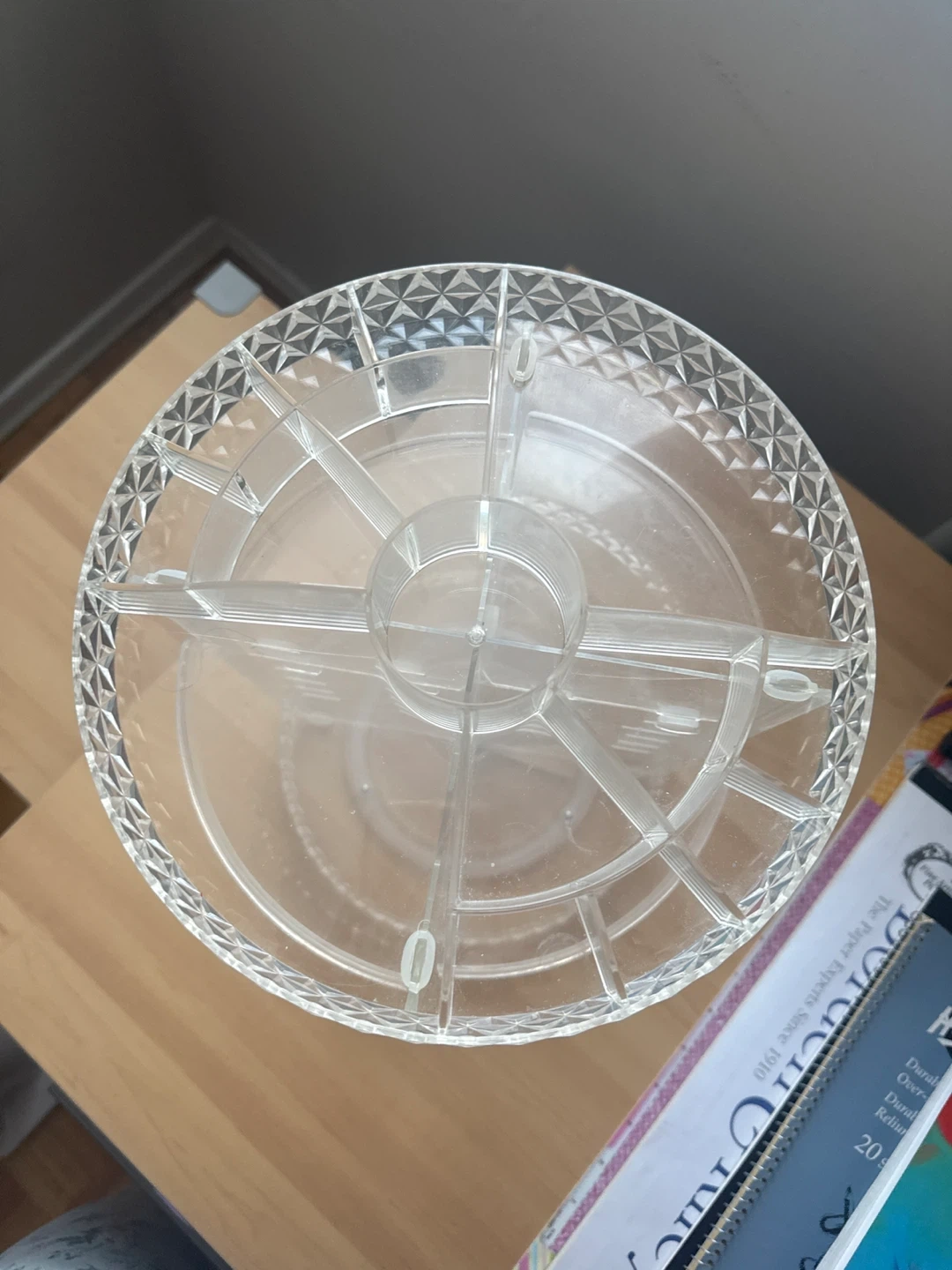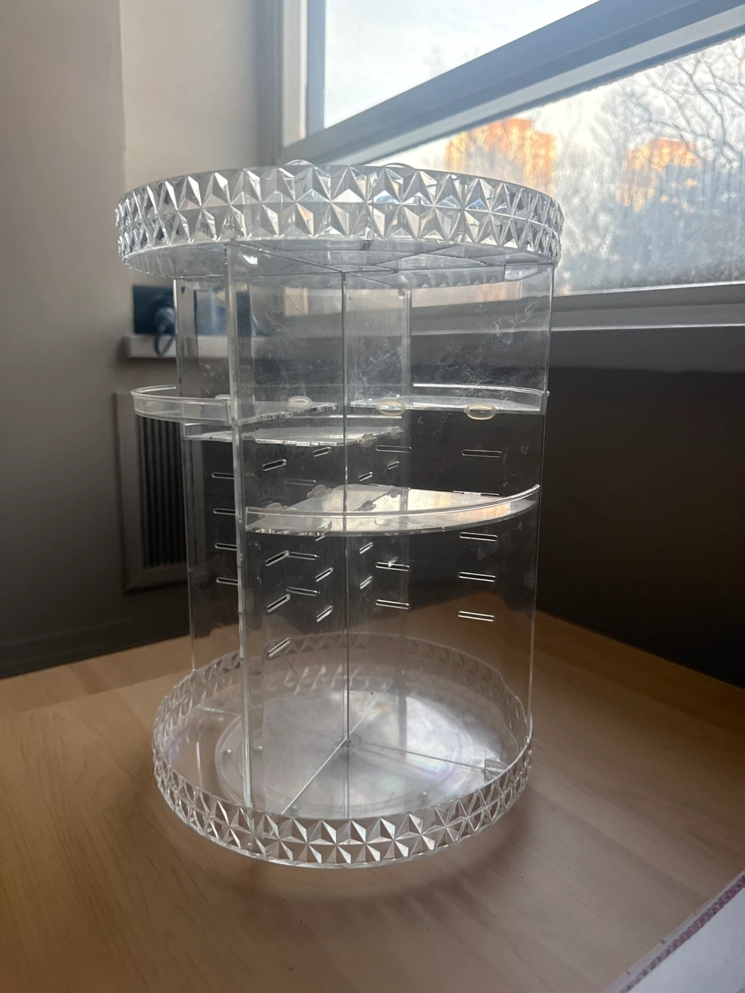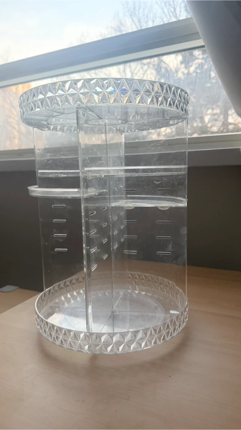 This clear acrylic organizer spins for easy access to your makeup and accessories. It features multiple compartments and adjustable tiers to store various items. Great for keeping your vanity tidy and products within reach!