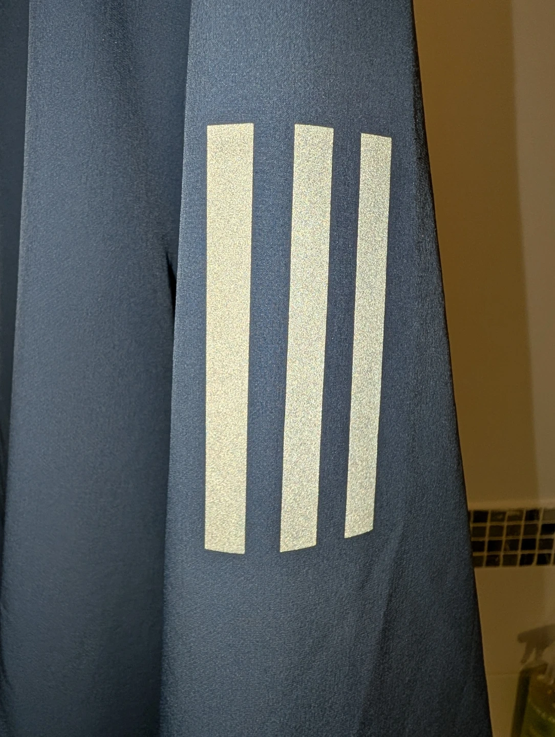 It's a lightweight, hooded jacket with reflective stripes on the sleeve and chest logo.