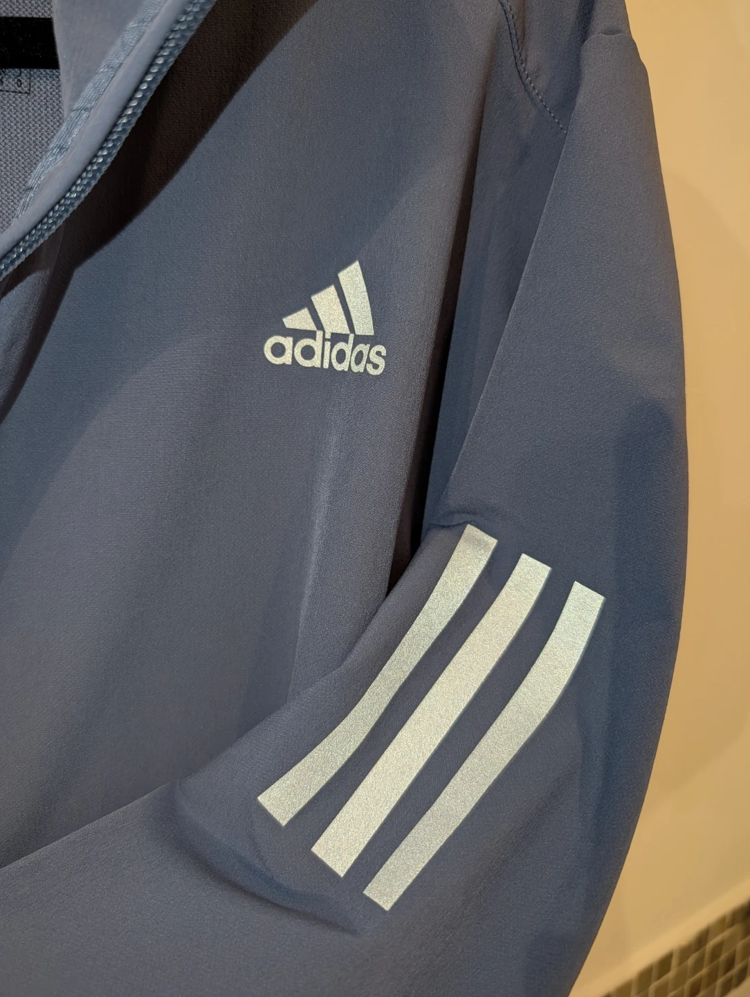 Greyish blue Adidas running jacket in size Medium, but fits like a Large.