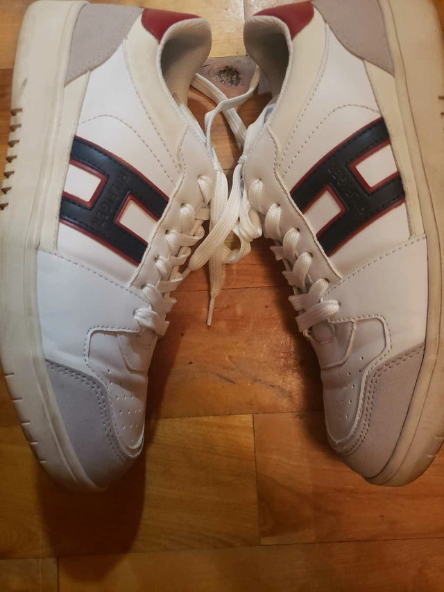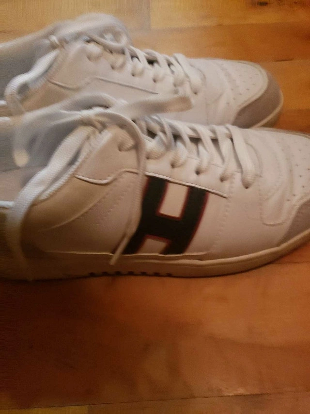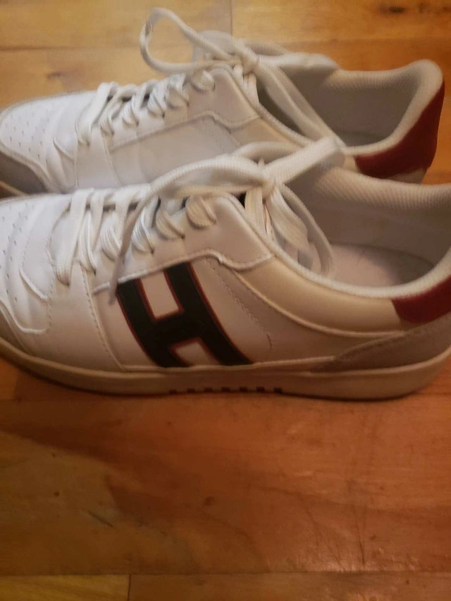 These Tommy Hilfiger sneakers feature a stylish white design with the iconic 'H' logo on the side, perfect for a casual yet fashionable look. They are used but still in good shape. Size details available upon request. I'm pricing these at $35. If the ad is up, they are still available!