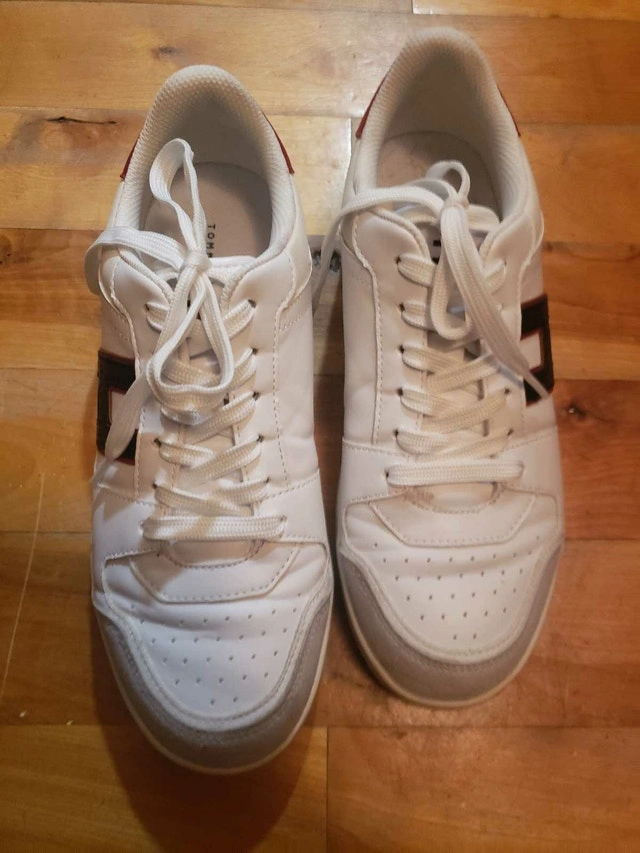 These Tommy Hilfiger sneakers feature a stylish white design with the iconic 'H' logo on the side, perfect for a casual yet fashionable look. They are used but still in good shape. Size details available upon request. I'm pricing these at $35. If the ad is up, they are still available!