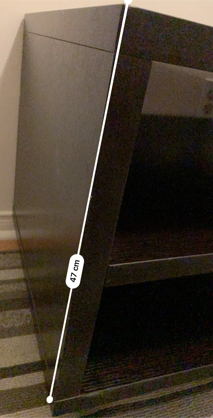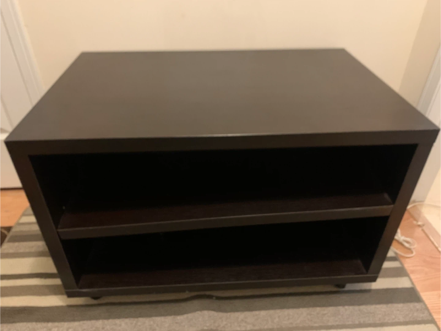 This dark brown media console has two open shelves, perfect for storing electronics or displaying decor. It's a sturdy unit suitable for any living room. Its simple design fits most decors.