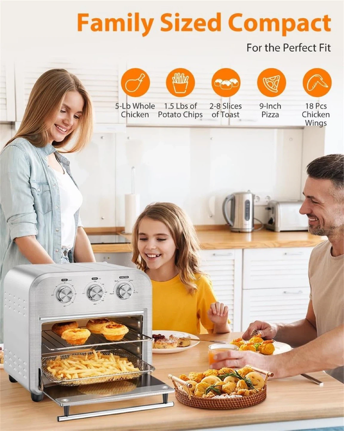 Cater to Family Needs: Featuring a 14QT capacity and 3-layer even cooking, this toaster oven fryer can accommodate up to 4 slices of bread, a 9-inch pizza, or 700g of chicken wings.