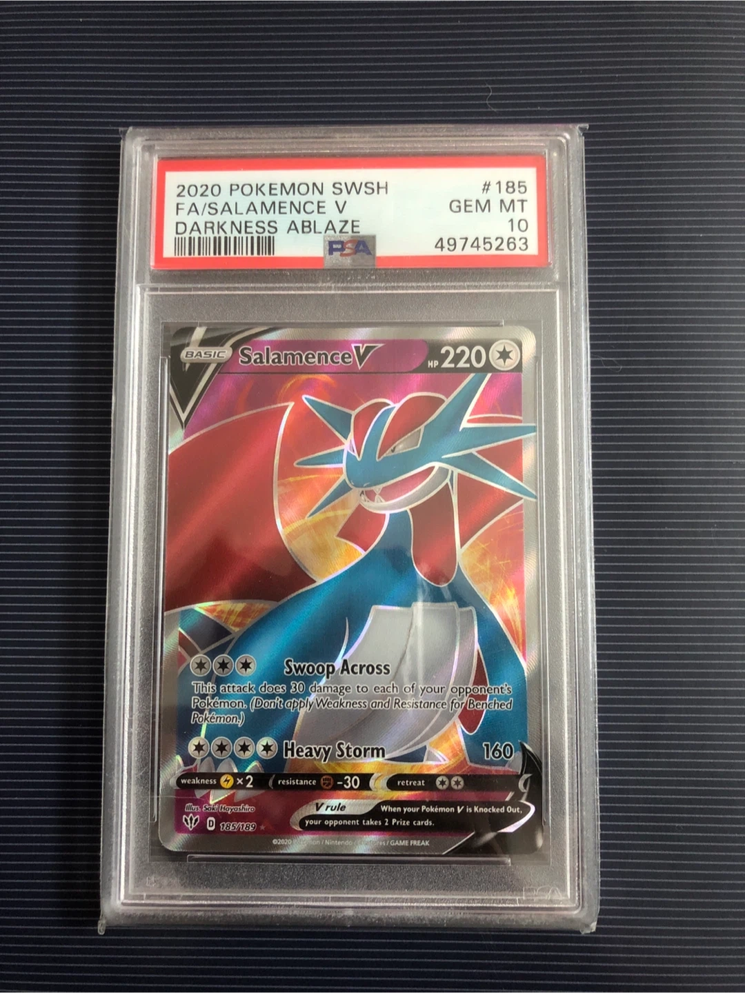 2020 Pokemon Sword & Shield FA Salamence V card. Graded Gem Mint 10 by PSA. Full Art card with #185 designation. It's a V rule card with 220 HP.