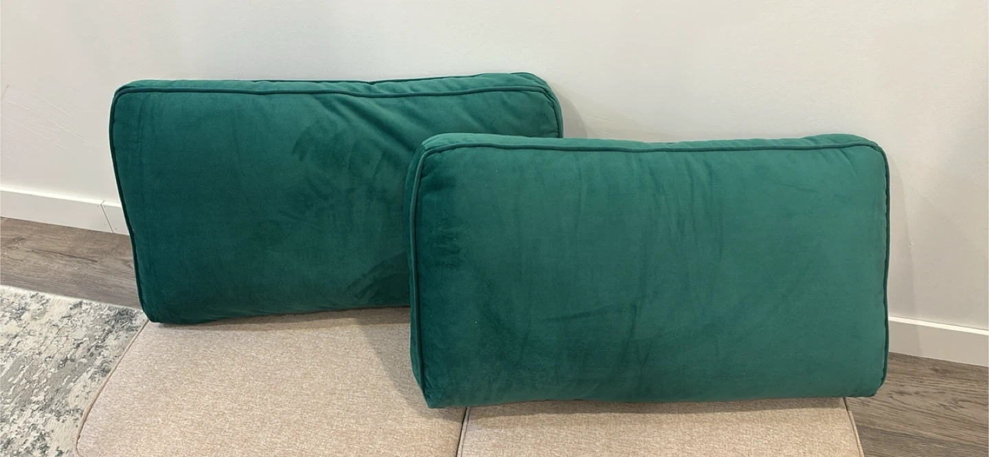 This brand new cushions They're upholstered in a durable beige fabric. The green velvet bolster pillows Made with sturdy materials for lasting comfort.