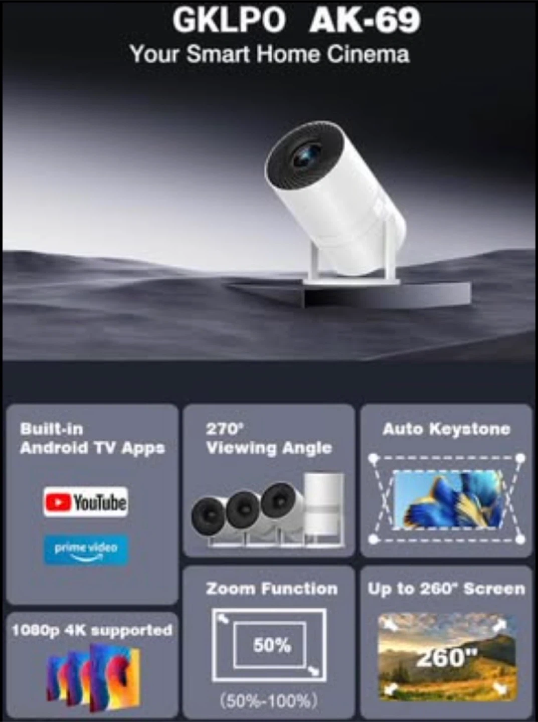 The First Cost Effective Smart Projector Ever ; NetfIix /Prime Video /YouTube Officially-Licensed; Smart TV OS to Support 1,000,000+ Videos; 16W Strong Speakers & 3D DoIby Audio ; Auto Focus & Auto Keystone Correction ; HDR10 and MEMC Technology ; Native 1080P 60Hz and 4K Supported; Ultra Bright; Two-way Bluetooth 5.2 & 5G+2.4G WiFi ; Lower Noise<40dB ; Input:100-240V~,50/60Hz