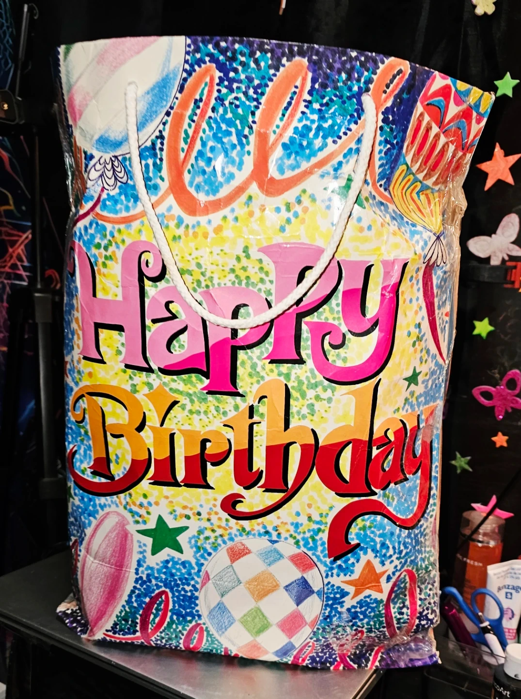 This is a large, colourful gift bag with a 'Happy Birthday' design. It comes with multiple smaller gift bags and tissue paper inside. Perfect for packing presents for a birthday celebration!