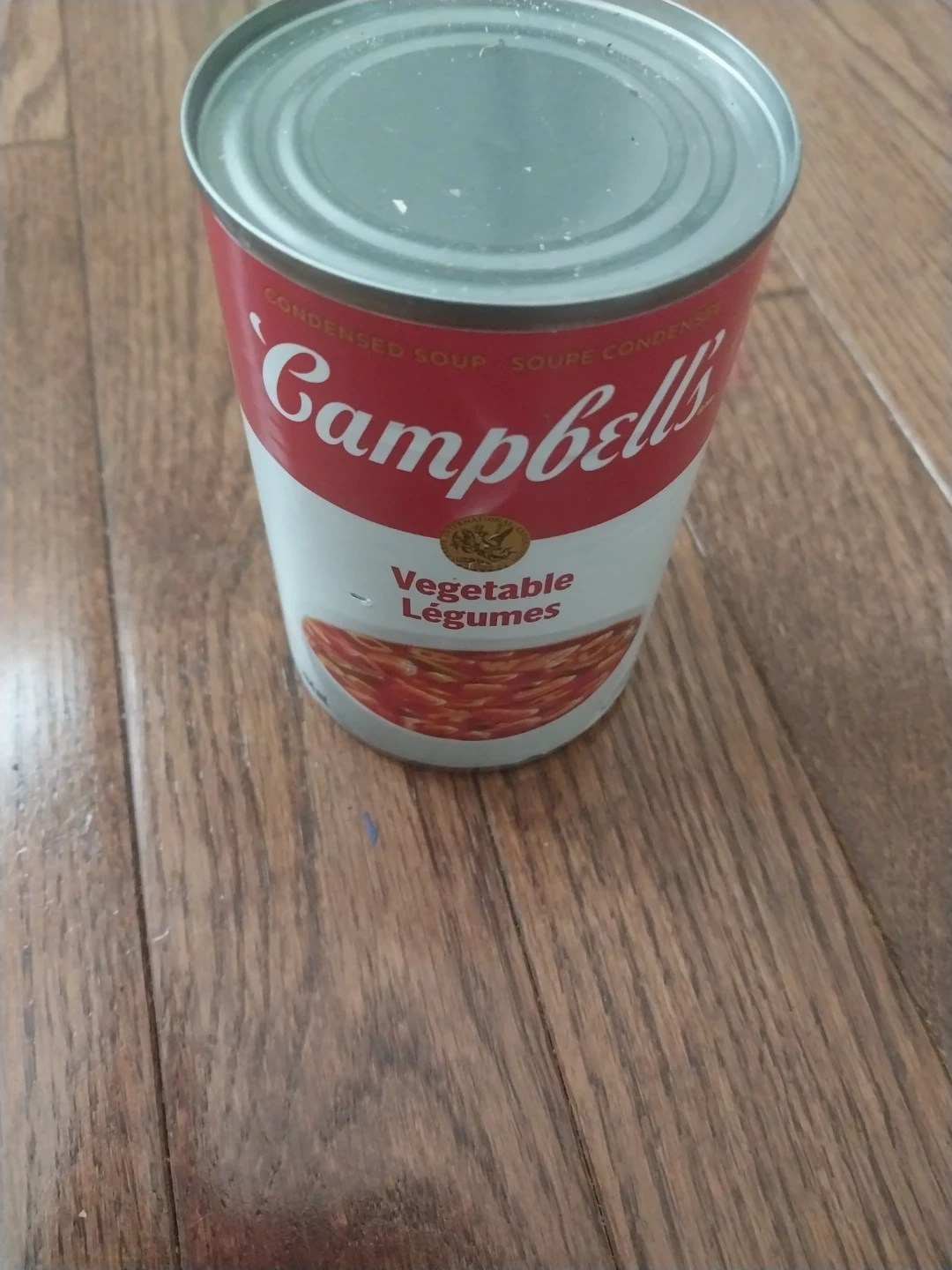 A can of Campbell's Condensed Vegetable soup. It's a savoury blend of vegetables in a hearty broth. This soup's expiry date is May 21, 2031.
