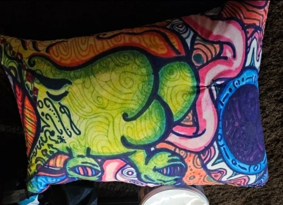 Vibrant throw pillow featuring a unique, colourful psychedelic art print. It's perfect for adding a pop of colour to any room. This pillow is soft and decorative.