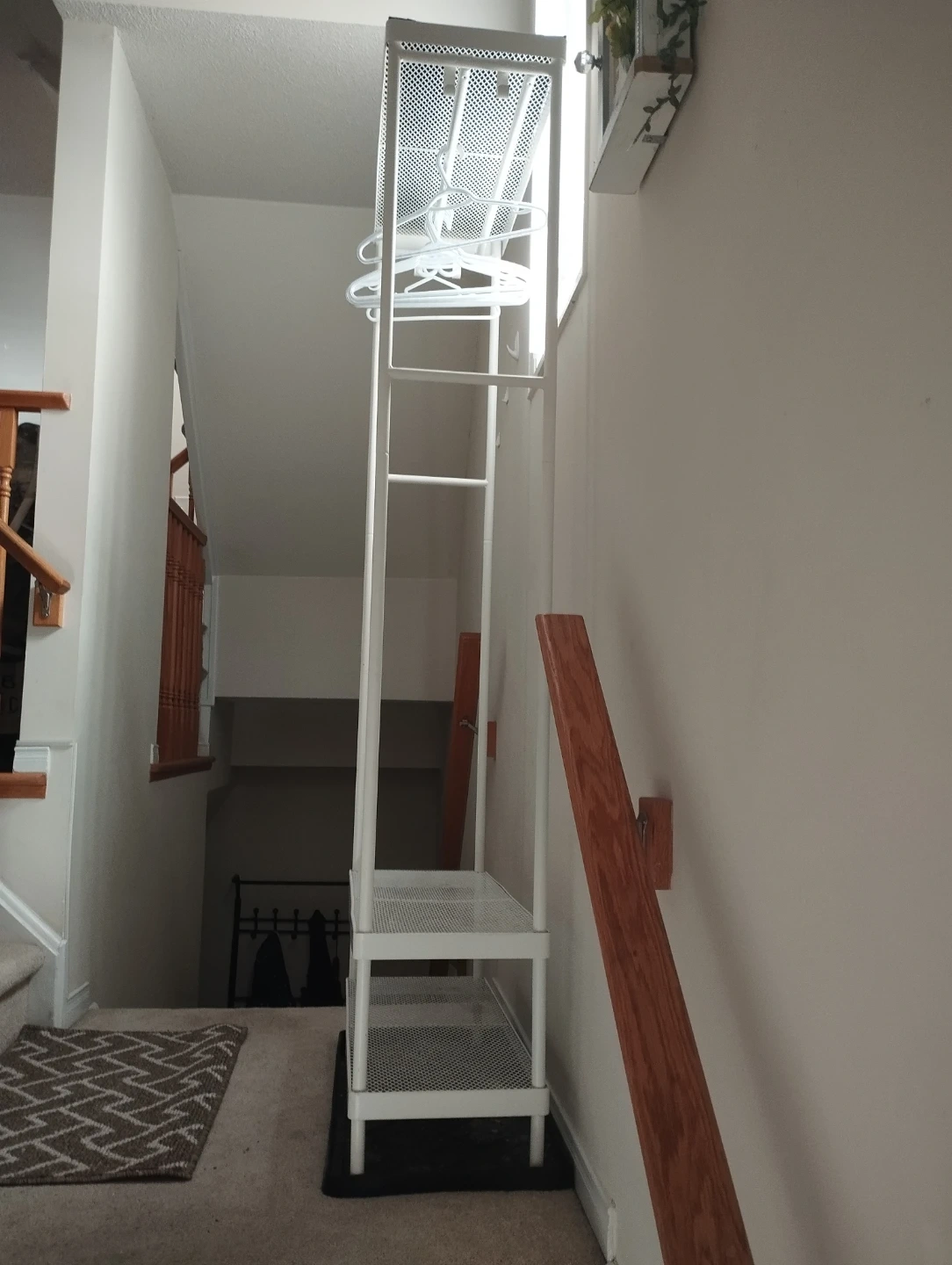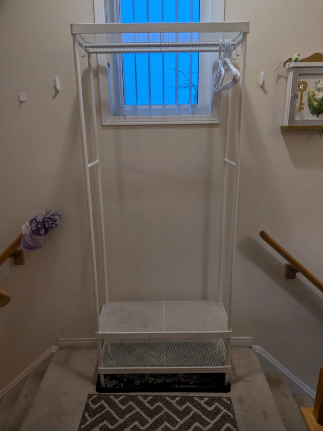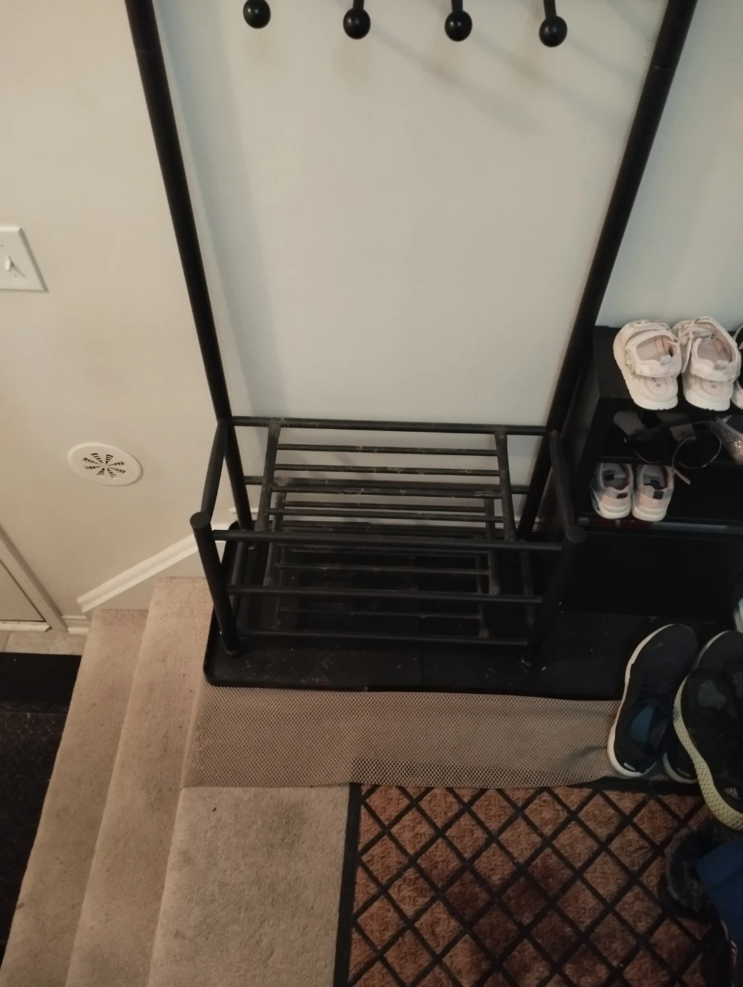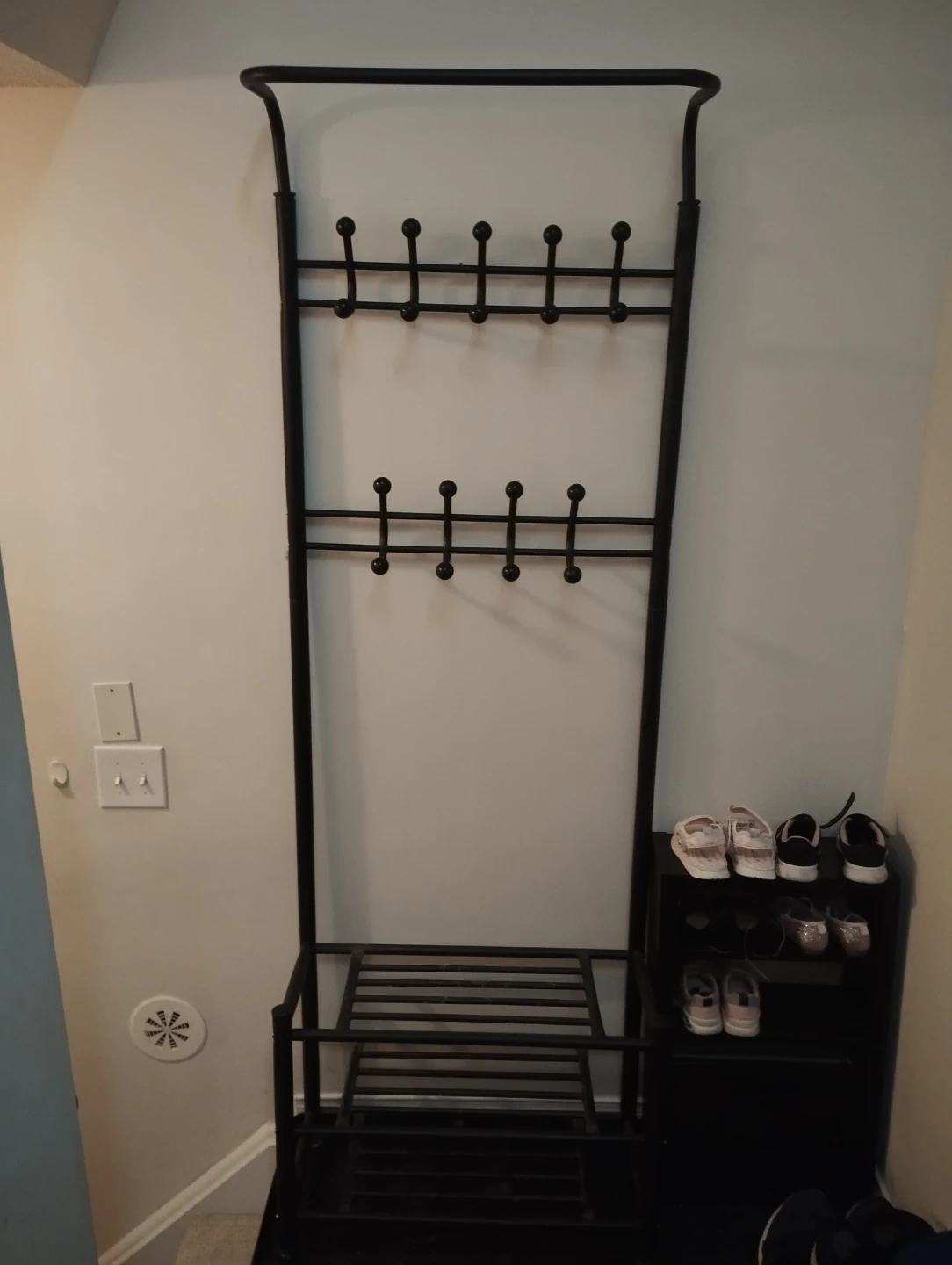 metal entryway rack with multiple hooks for coats/bags and a shoe storage shelf at the bottom. Perfect for organizing your hallway, mudroom, or closet.