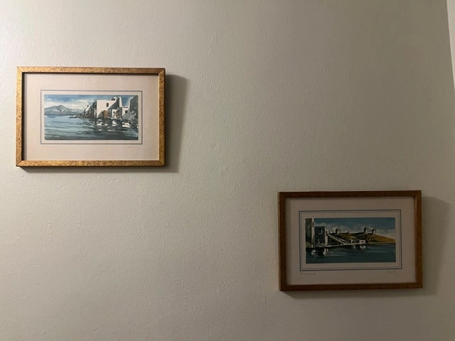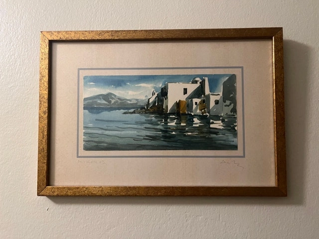 Two watercolour paintings of Greece, Mykonos, featuring sunny views from the sea. They are presented in speckled gold-coloured frames, signed by the artist, and ready to be hung.