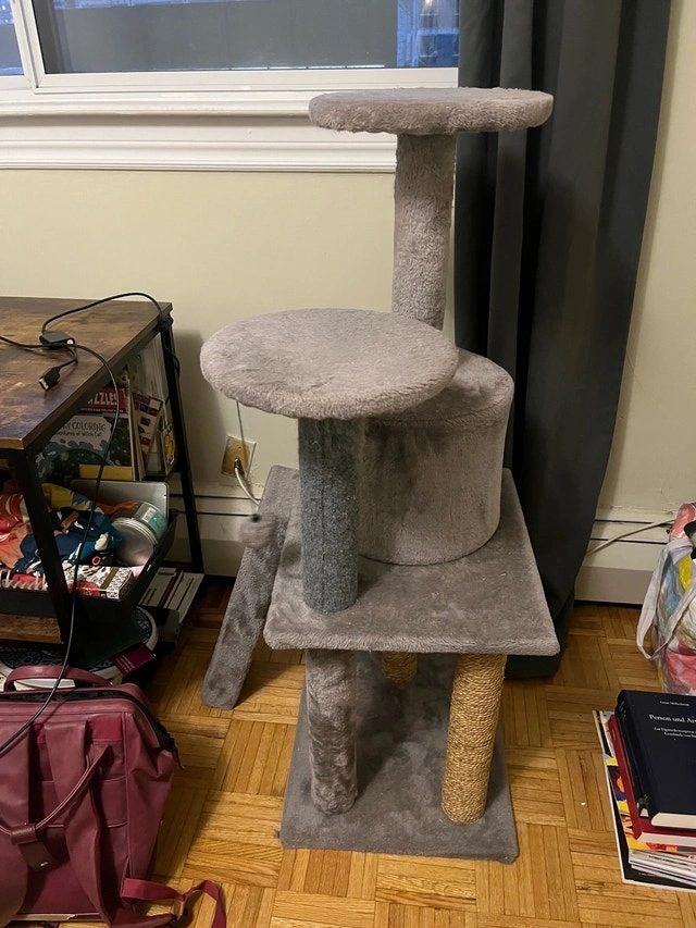 Large grey padded cat tree with house and 3 scratchers, and toy. Great condition, has been taken apart for transport and fits in one large box.