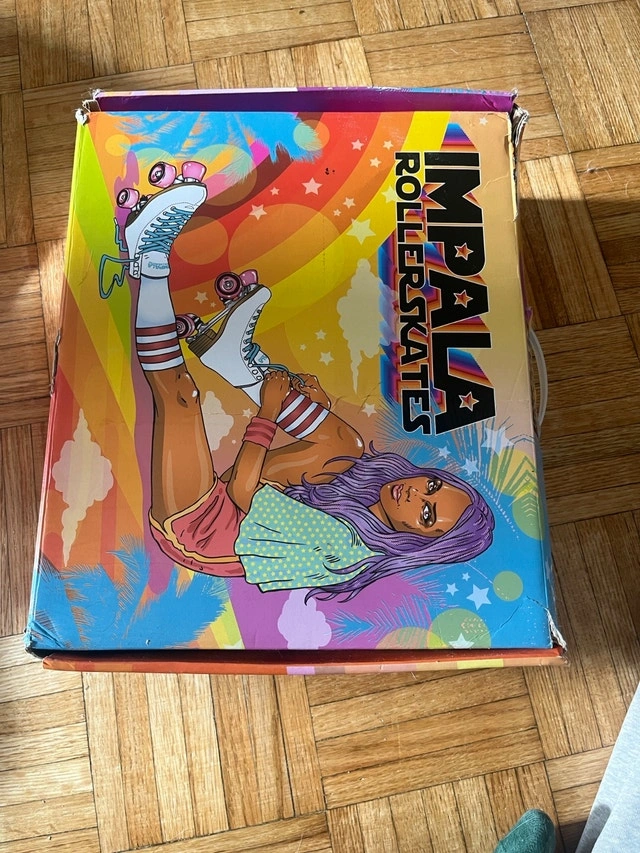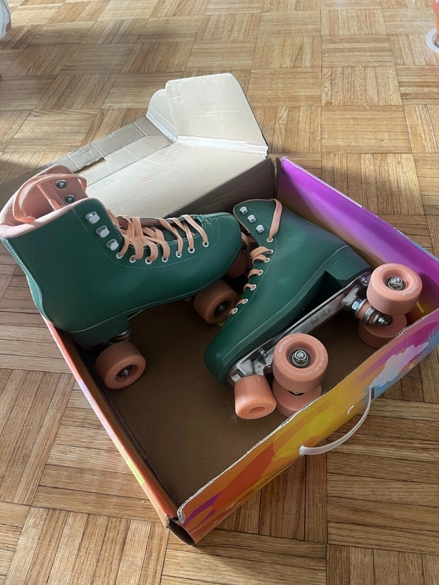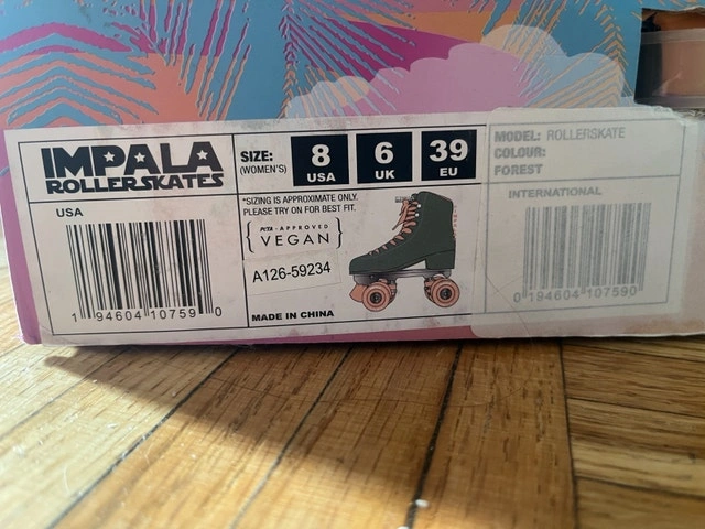 New Impala quad roller skates. Women's size 8 in cute green and light pink. Comfortably padded and recommended for beginners/casual skating. Full protective gear (size small) and new helmet also available (check my other listings, $70 for skates+protective set+helmet).