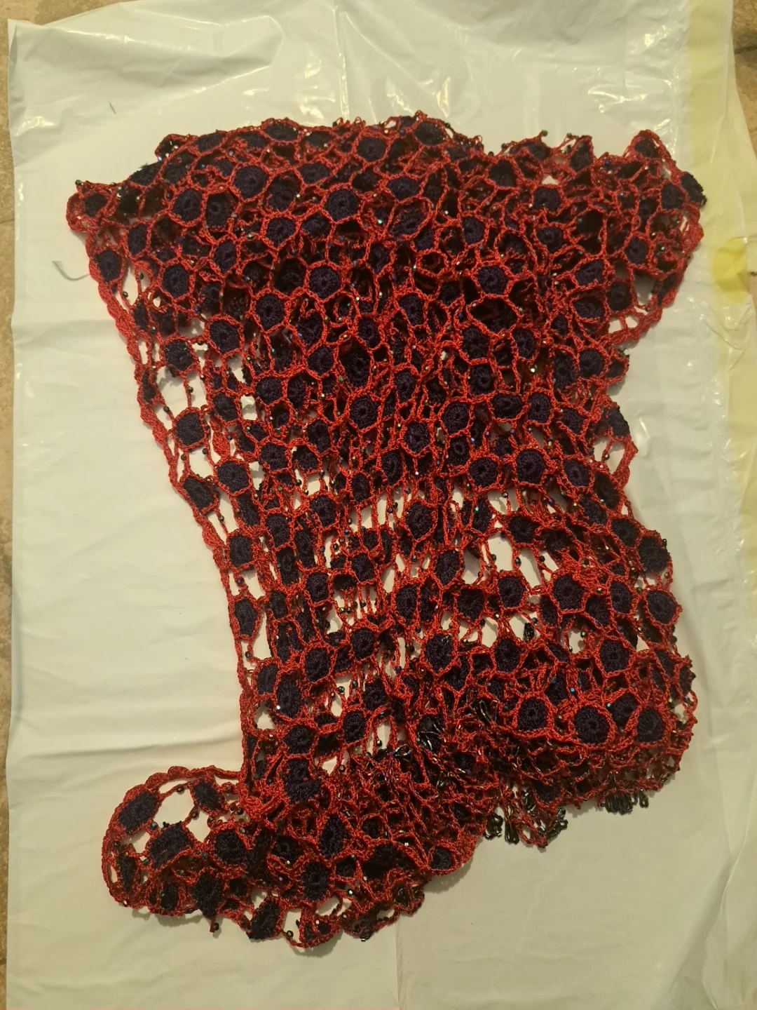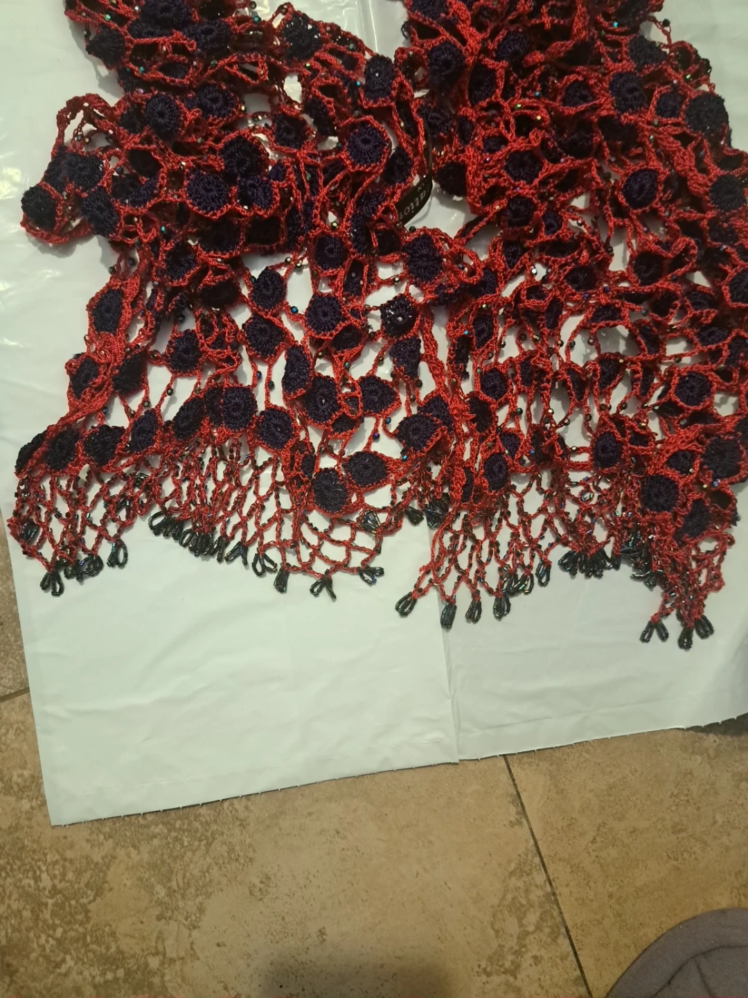 Red and Navy Blue Crocheted Scarf with Beads