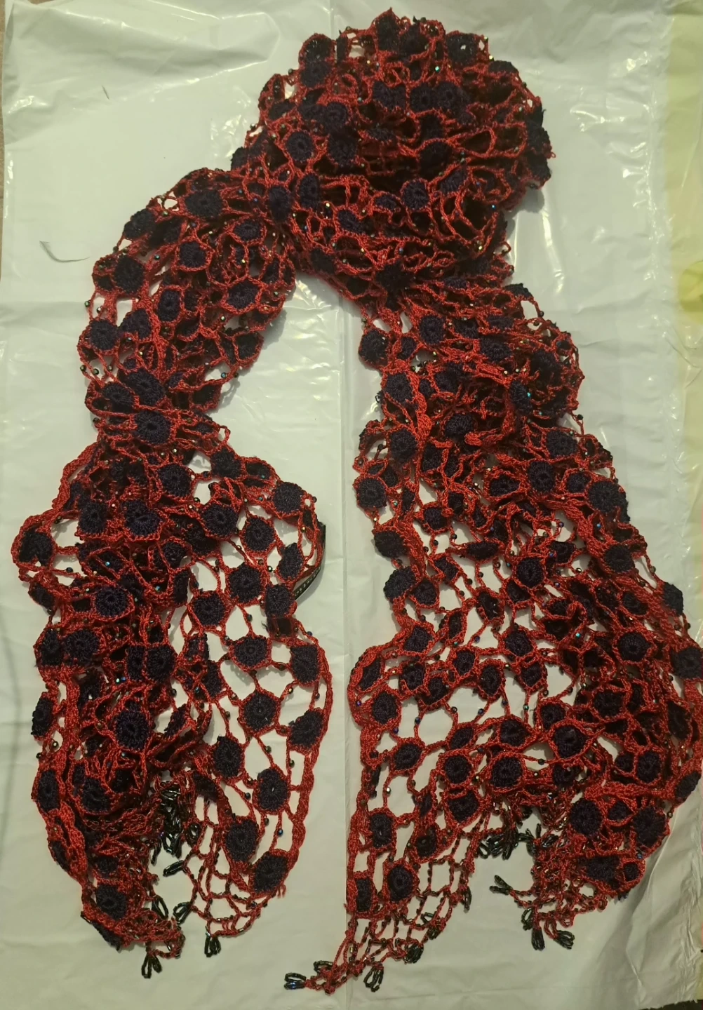 This is a handmade crocheted scarf in a beautiful red and navy blue colour combination. It features intricate floral patterns and is adorned with small beads throughout. The fringe adds a lovely finishing touch to this unique accessory.