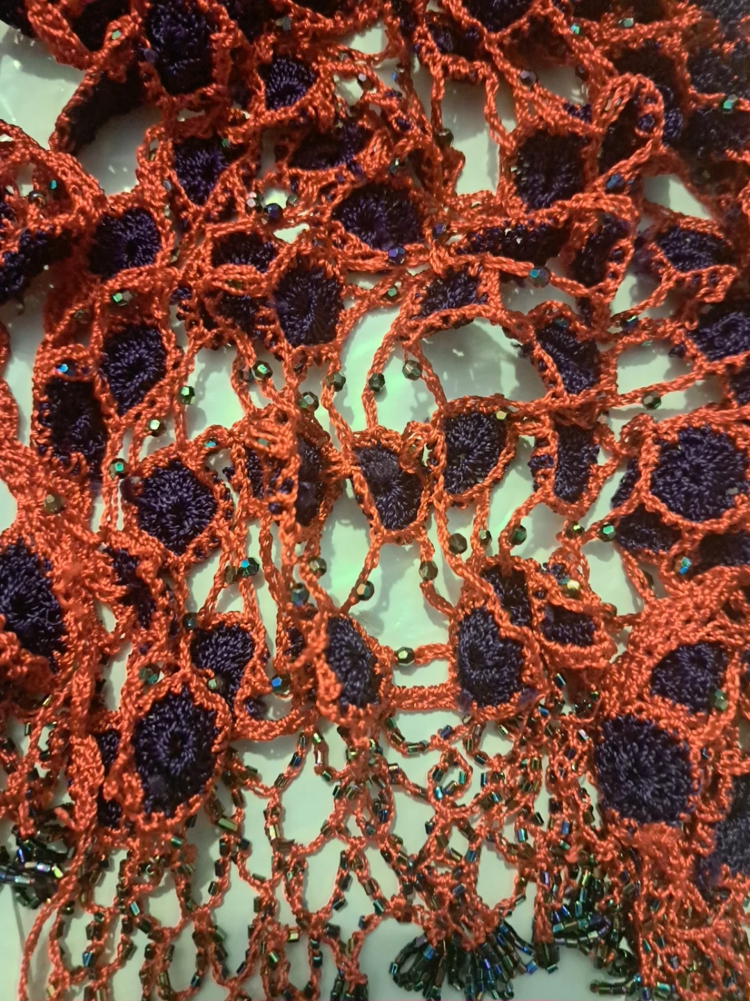 Red and Navy Blue Crocheted Scarf with Beads