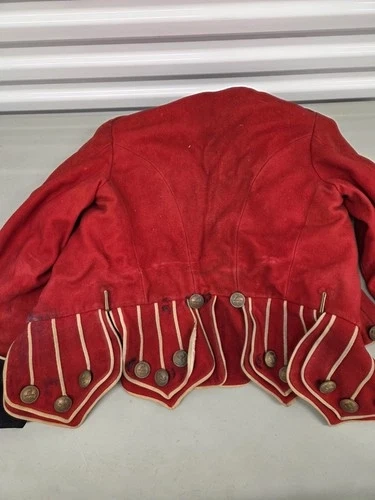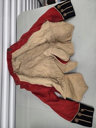 Authentic Victorian-era Scottish Highland military tunic, dating to approximately 1860–1875, associated with Scottish Highland Volunteer or Militia units. This is an original 19th-century garment, not a reproduction. It features scarlet red wool construction with a heavy period canvas/linen lining, a short coatee-style cut with split skirt tails, black cuffs with original brass buttons, and decorative skirt panels with original piping. The original brass buttons are stamped “HIGHLANDERS” with a thistle emblem. There's a handwritten period marking inside, likely an original issue or tailor notation. Buttons marked simply “Highlanders” were commonly used by Scottish Volunteer and Militia Highland units. This uniform was worn during the Victorian Volunteer Movement. It is in good antique condition consistent with age and service, with honest wear, fading, and staining present. No modern repairs are observed, and all buttons appear original. The fabric remains structurally sound for display. Please review all photos carefully, as they form part of the description. This listing is for the tunic only; no trousers, belt, or accessories are included. Ideal for collectors, museums, reenactors, or historical display.