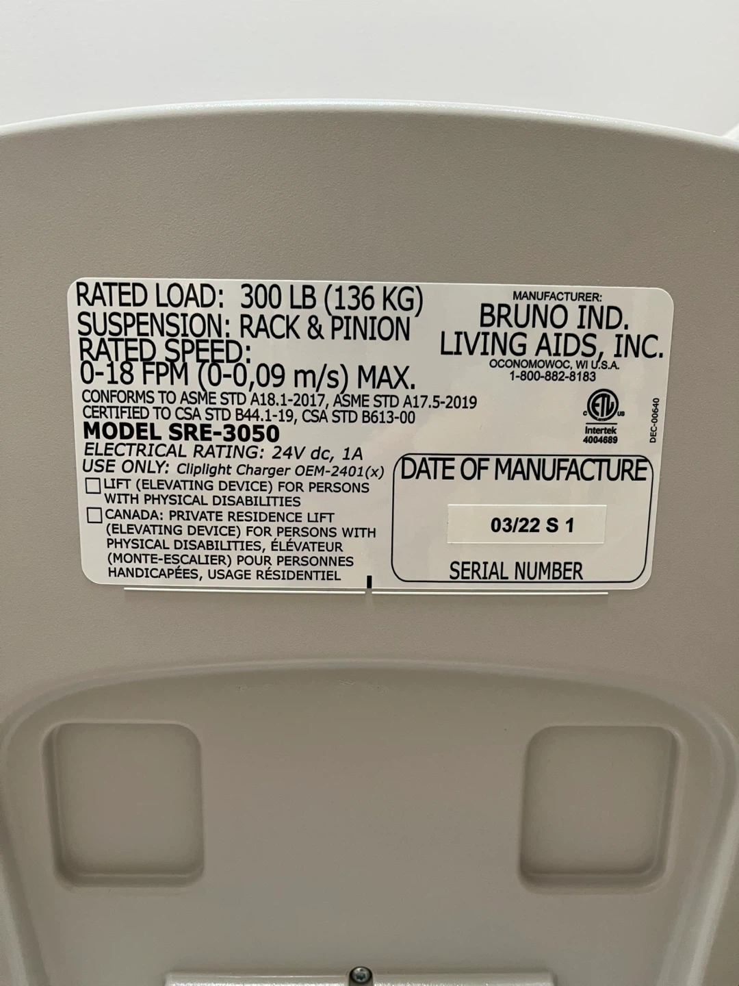 It has a rated load of 300 lbs (136 kg) and a suspension of rack & pinion. The electrical rating is 24V DC, 1A. It's certified to ASME STD B44.1-19 and CSA STD B613-00. Date of manufacture is 03/22 S 1. This unit is designed for residential use.