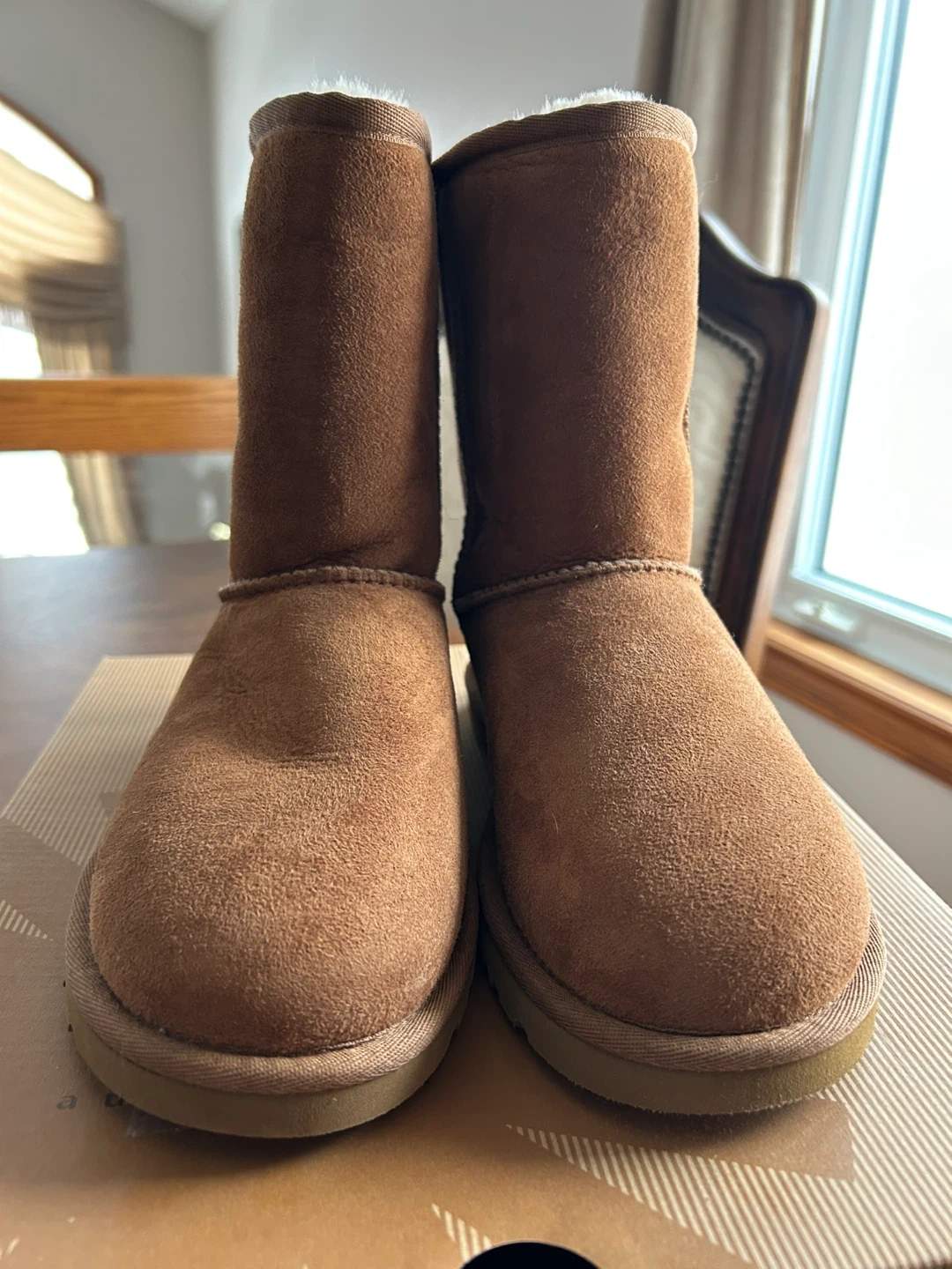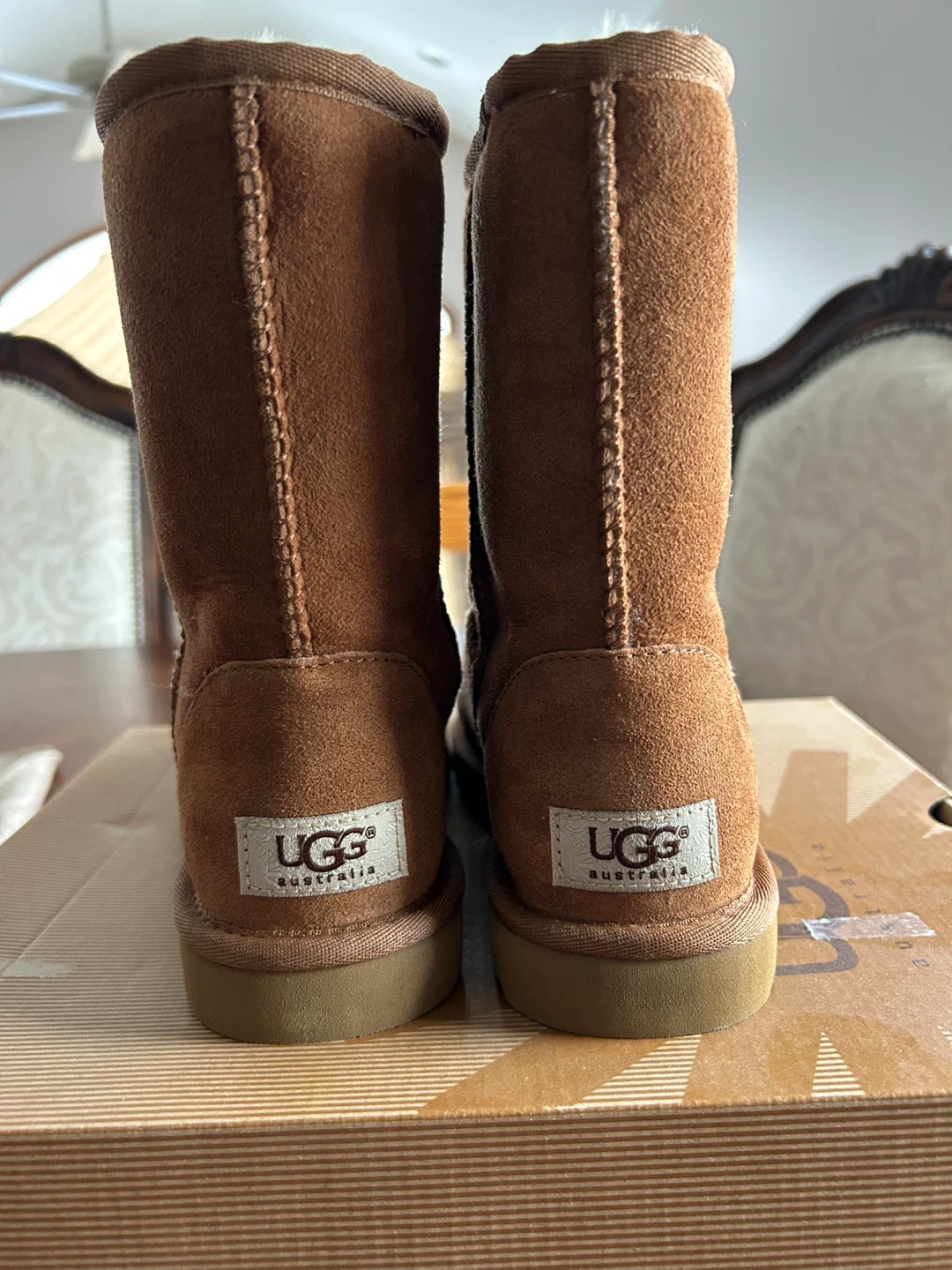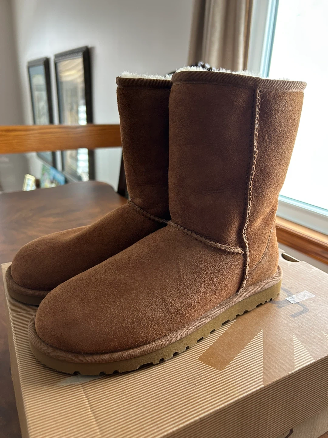 UGG Australia Classic Tall boots are made of chestnut suede with a cozy sheepskin lining, size 6. They're perfect for keeping your feet warm on chilly days. The boots come with their original box.